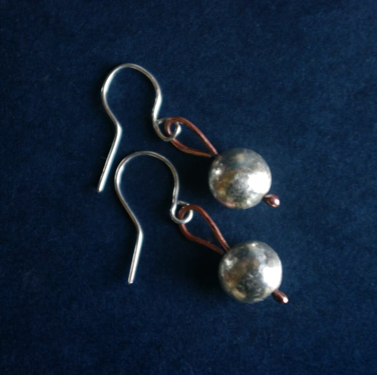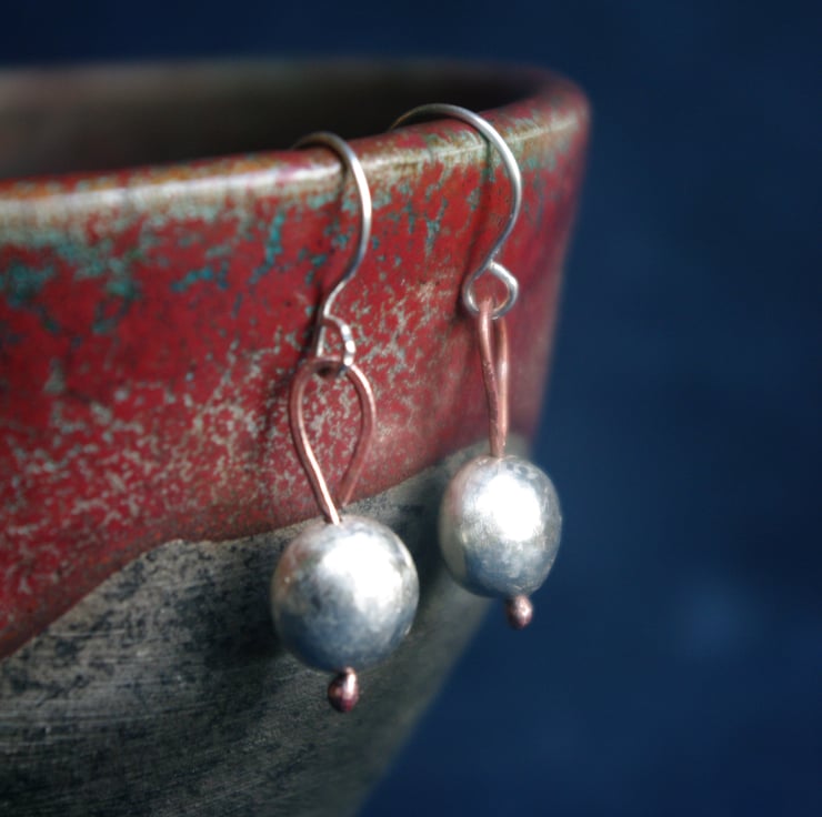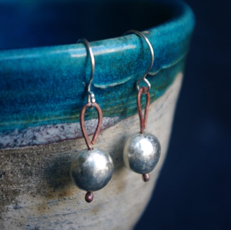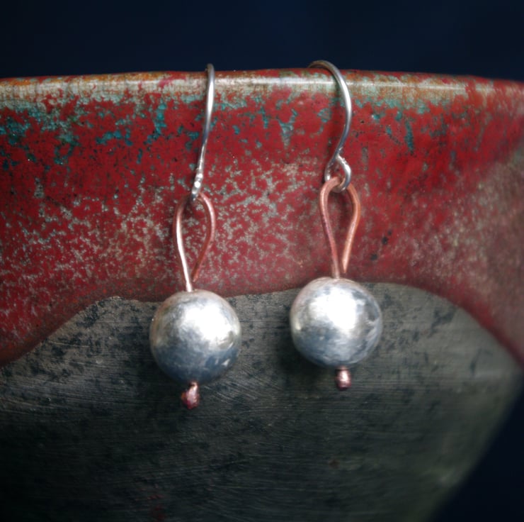 I have made small silver baubles, with a diameter of approx 9mm . A copper wire goes through the middle of the bauble with a blob of copper at the bottom and a teardrop shaped ring at the top which the handmade sterling silver ear hooks are attached to. The total dangle is 30mm from the top of the ear hook.