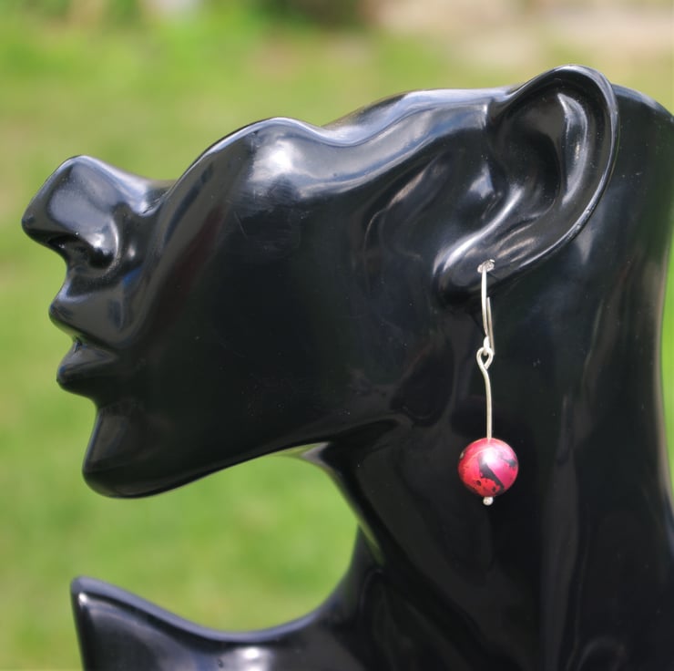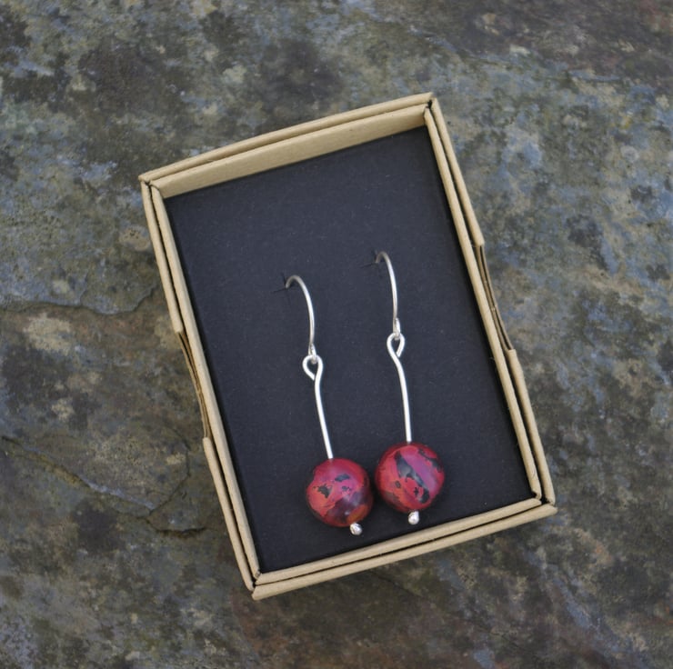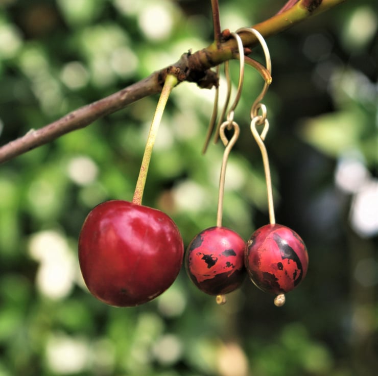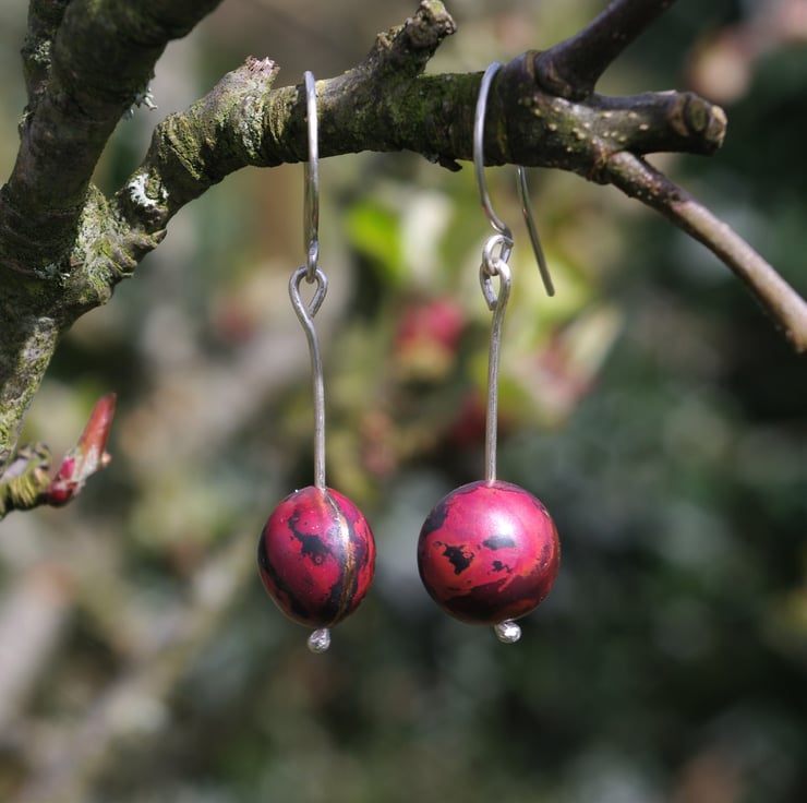 Copper baubles with a diameter of 12mm hang from a reticulated eco sterling silver handmade ear hook. The copper has acquired different red tones as a result of heat. The baubles are kept in place by a pleasing blob of silver on the end of the ear hook . The total dangle is 45mm/ 1.75 inches and the copper sphere moves freely about.
