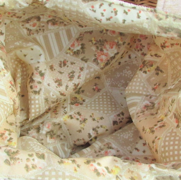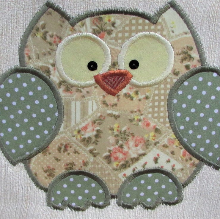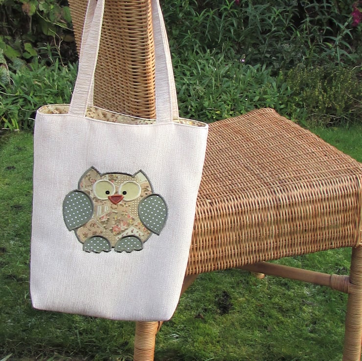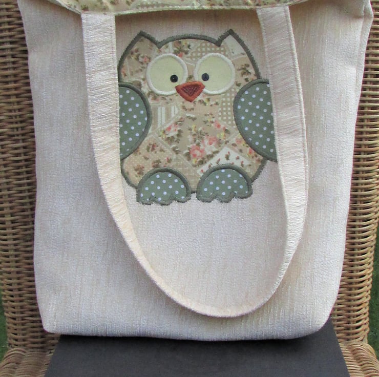 A handy owl tote bag in textured peachy cream fabric with a cute applique owl. The main body of the owl is made from a floral patchwork print fabric in shades of beige, peach, cream, sage green and yellow. The wings and feet are sage green with white polka dots. The owl has an orange beak and pale yellow eyes embellished with black sequins. The bag is fully lined with patchwork print fabric which matches the main body of the owl.