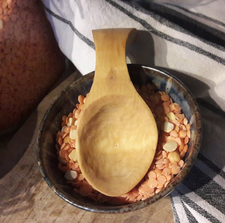Back in medieval times travellers would sometimes carry a small ladle with them with which to eat the soups and stews that they would frequently encounter on their journey. It was also known as a 'fist spoon' as it fits neatly into the hand, making it extremely portable. I make many of these and they are very popular as kitchen scoops. Coffee, pulses, flour, a nice, adaptable piece of handmade kitchen folk art.