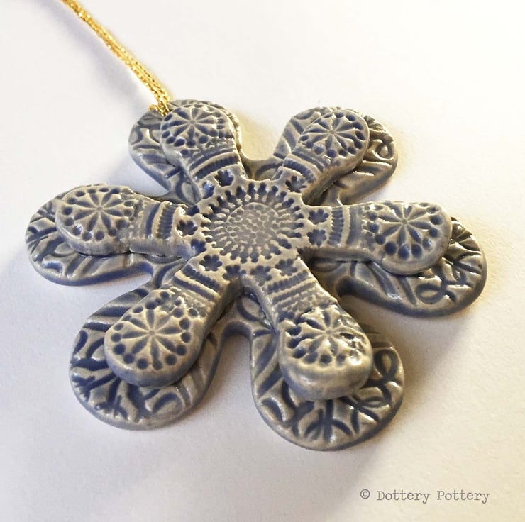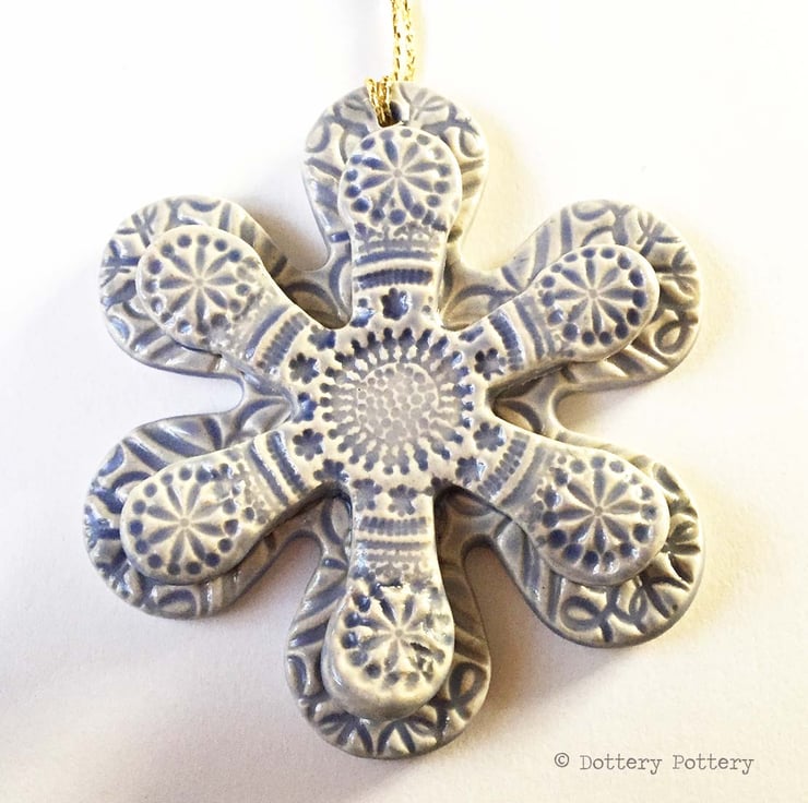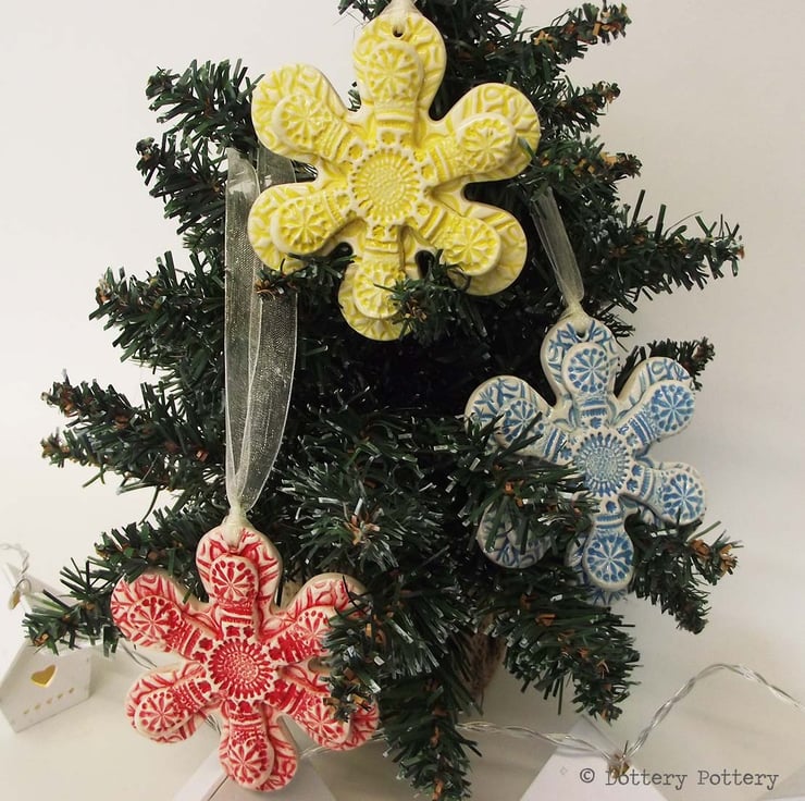 This cute Winter flower pottery decoration has been embossed with a snowflake pattern and finished with a bright, glossy glaze to the front. The back has been left plain.