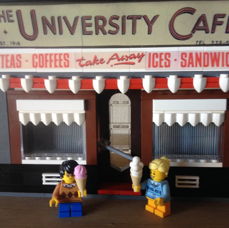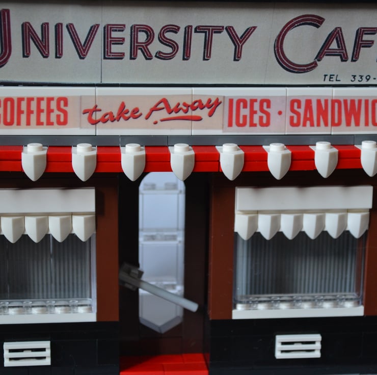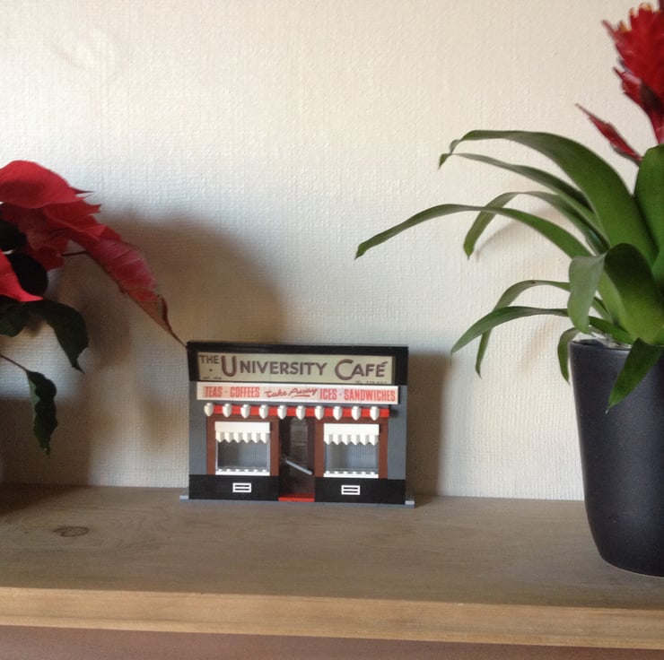 The University Cafe on Byres Road is one of the oldest businesses still thriving in Glasgow's West End. I've recreated its couthy, old-fashioned Scots-Italian character in this cute Lego model. Made from around 220 Lego Bricks, and decorated with stickers based on original photographs, it represents a beautiful decorative addition to the mantlepiece.