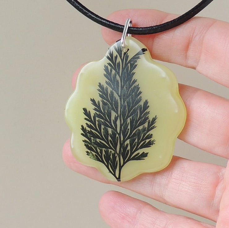 The leaf has been pressed and then dyed black before using it to make this pendant.