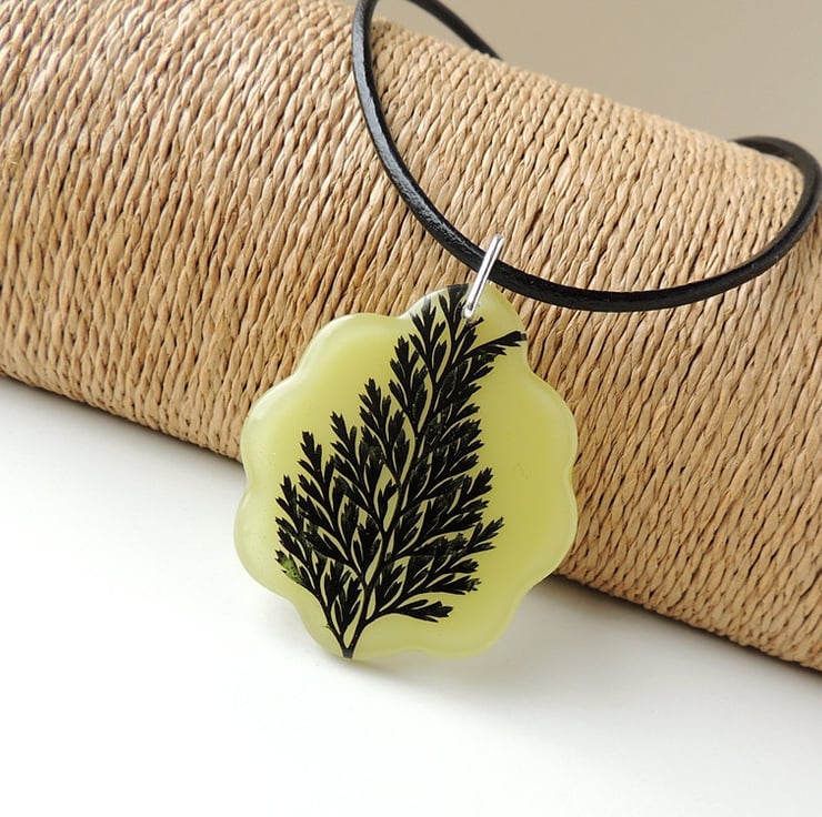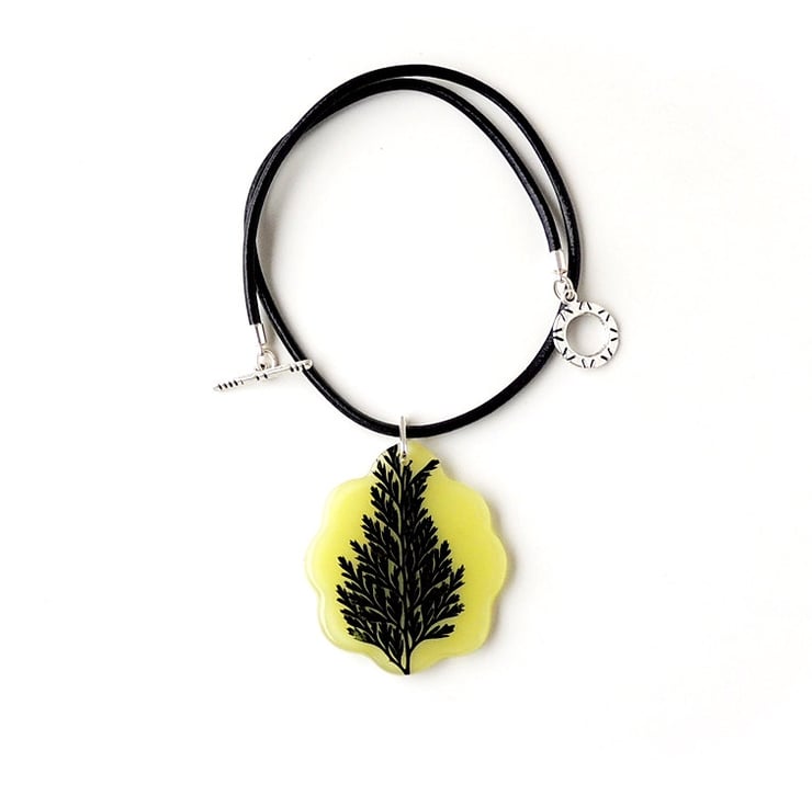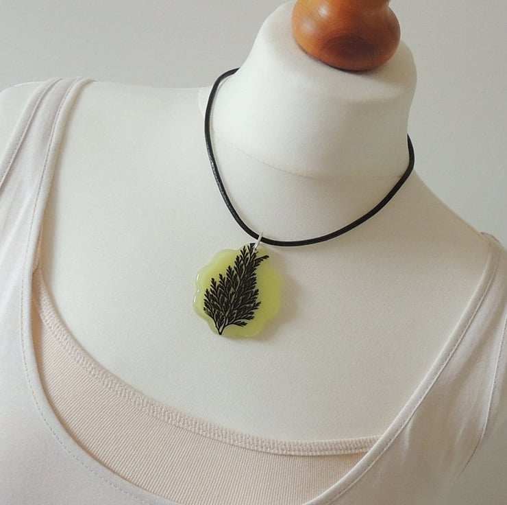 This statement necklace has a real leaf captured inside a pale lime green resin pendant. It comes on a black leather necklace.