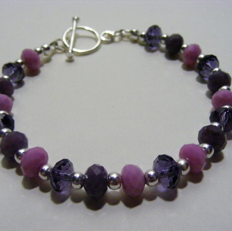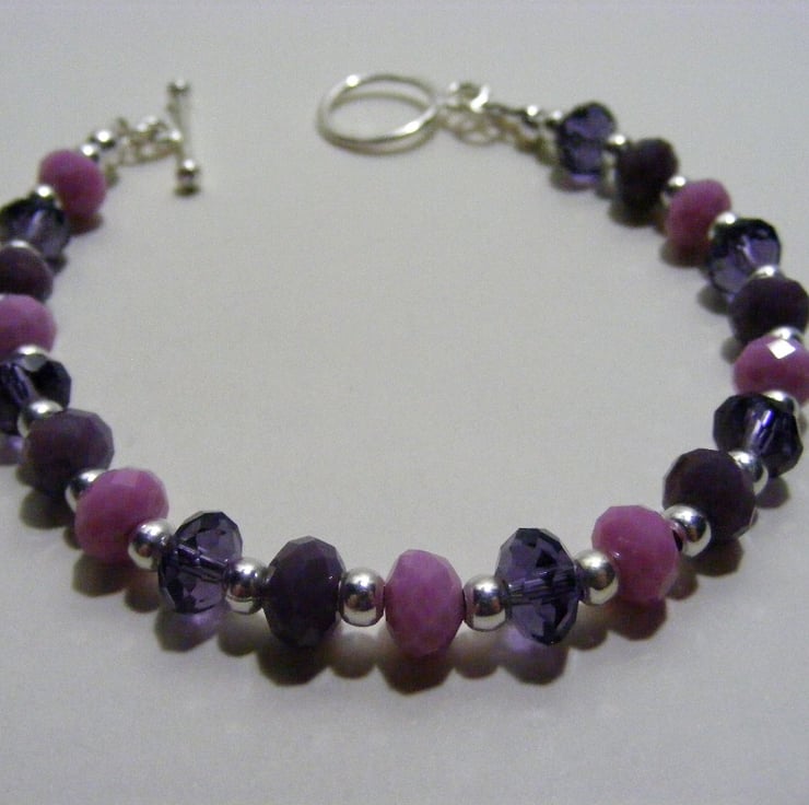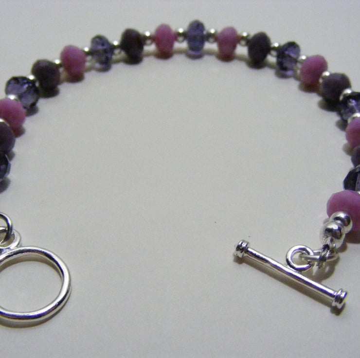 I have made this bracelet by threading 7 mm purple and pink glass rondelles onto silver beading wire with 4 mm silver plated spacers. Ends of beading wire are finished with silver plated findings and a silver plated toggle clasp.