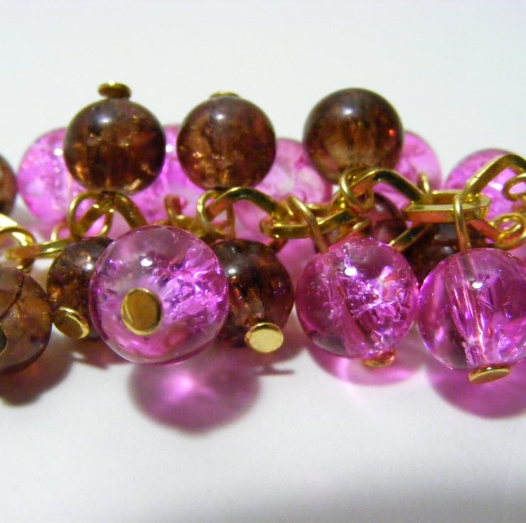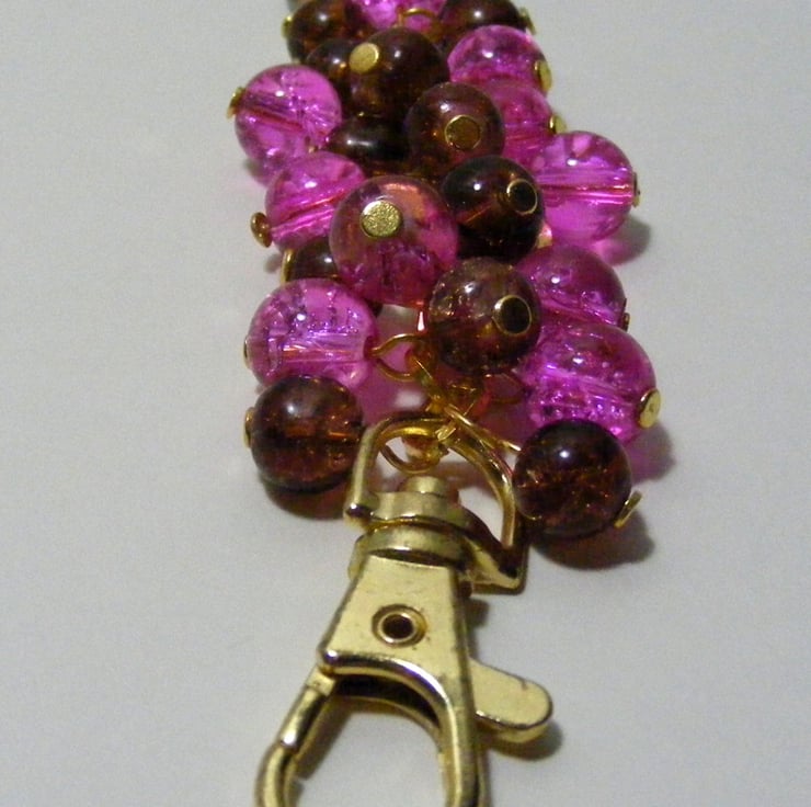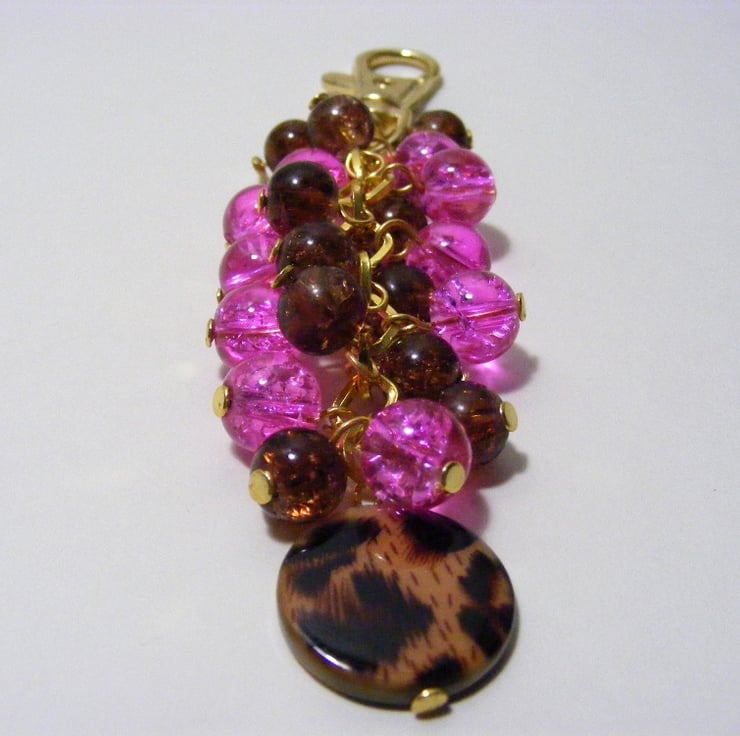 Bag charm is made with 10 mm pink crackle glass beads and 8 mm brown crackle glass beads. Beads are threaded onto gold plated headpins and attached to gold plated chain. On the bottom chain link I've attached a 20 mm tiger print shell coin. Swivel clip is gold plated.