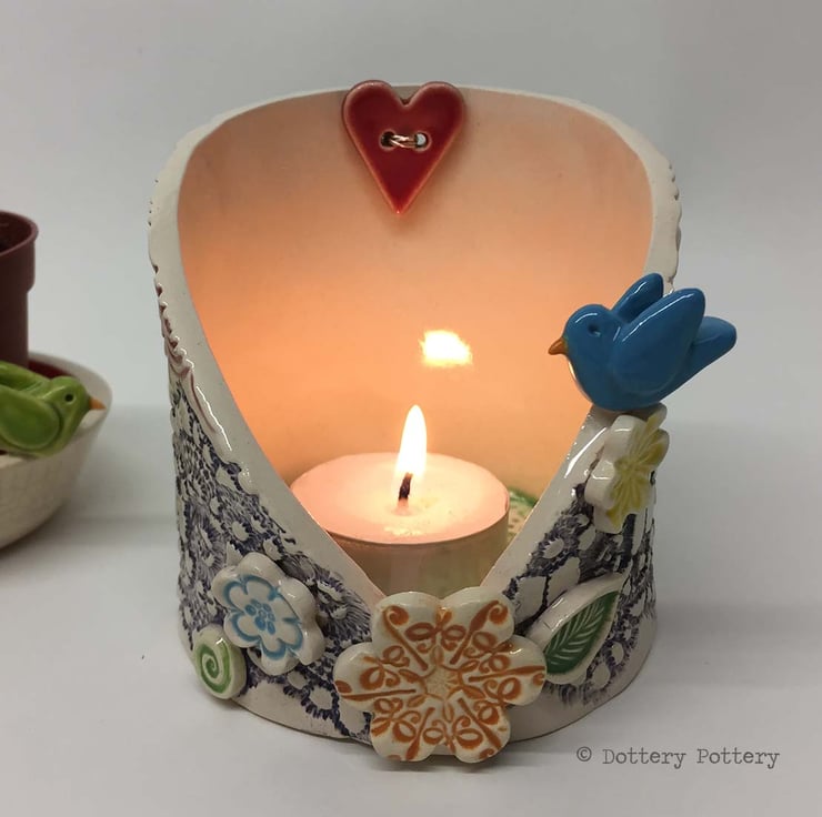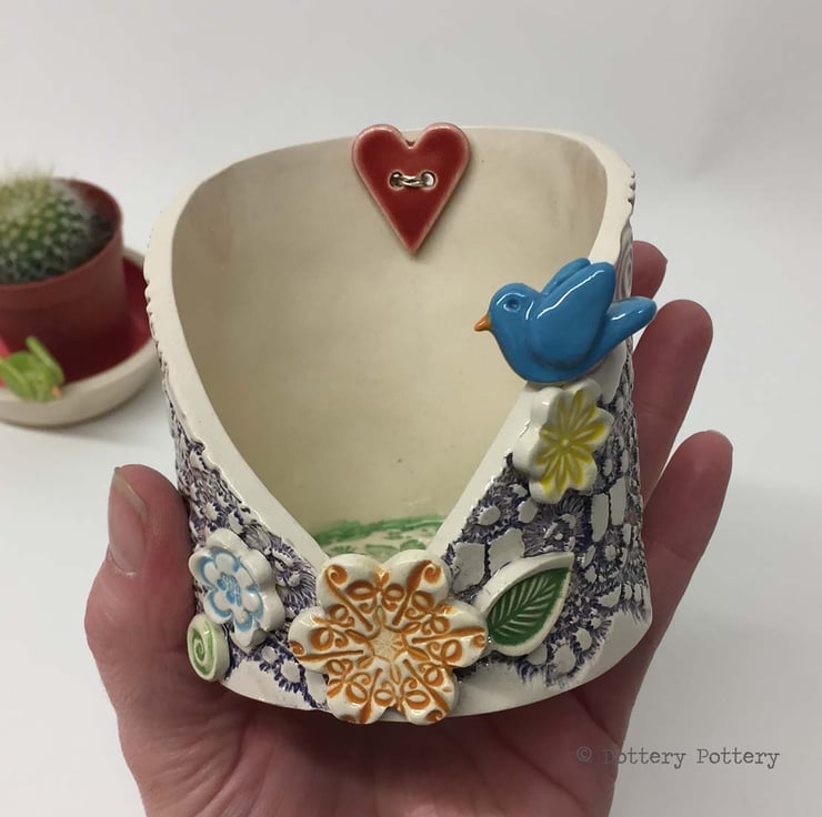 This ceramic pot is made from white earthenware clay, embossed with pattern and finished with flowers and a little bird.