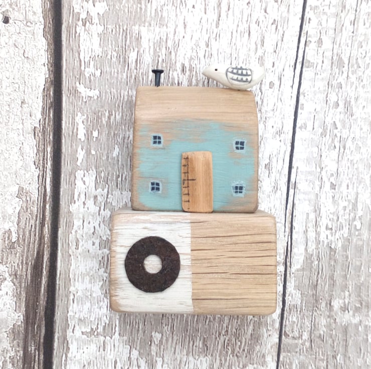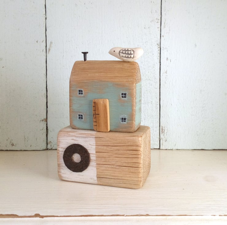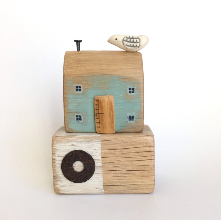 This hand carved and painted little rustic oak house is a seaside house, inspired by the shapes and colours of the harbourside and those cheeky seagulls that wait on the rooftops!