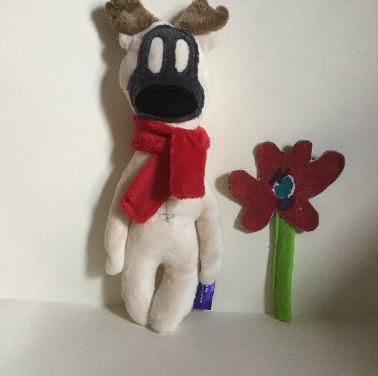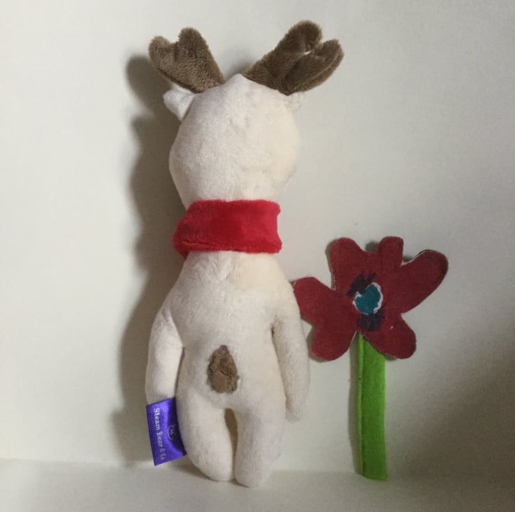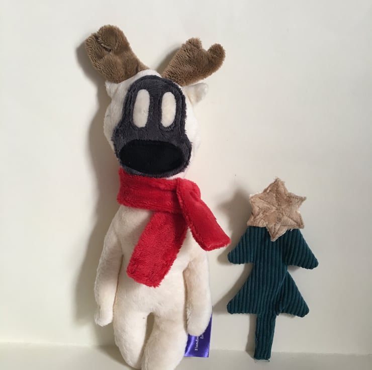 25cm from head to toe. Ivory plush body with grey plush face, black plush nose. Brown plush antlers with black embroidered eyes. A bright red plush scarf stitched around the reindeer’s neck.
