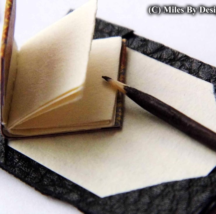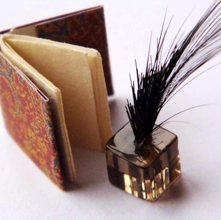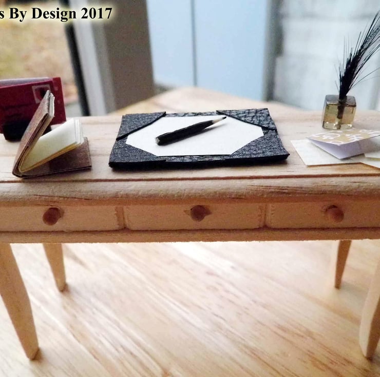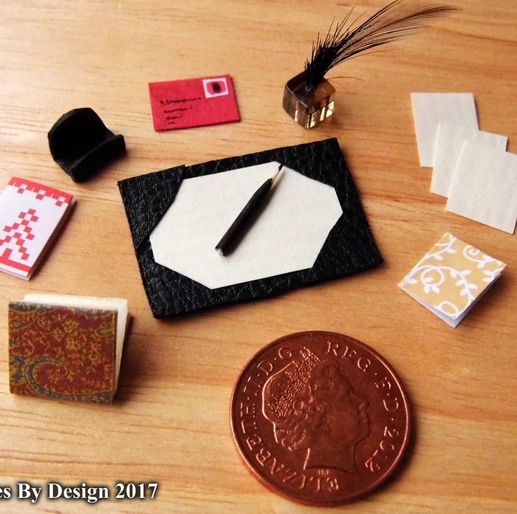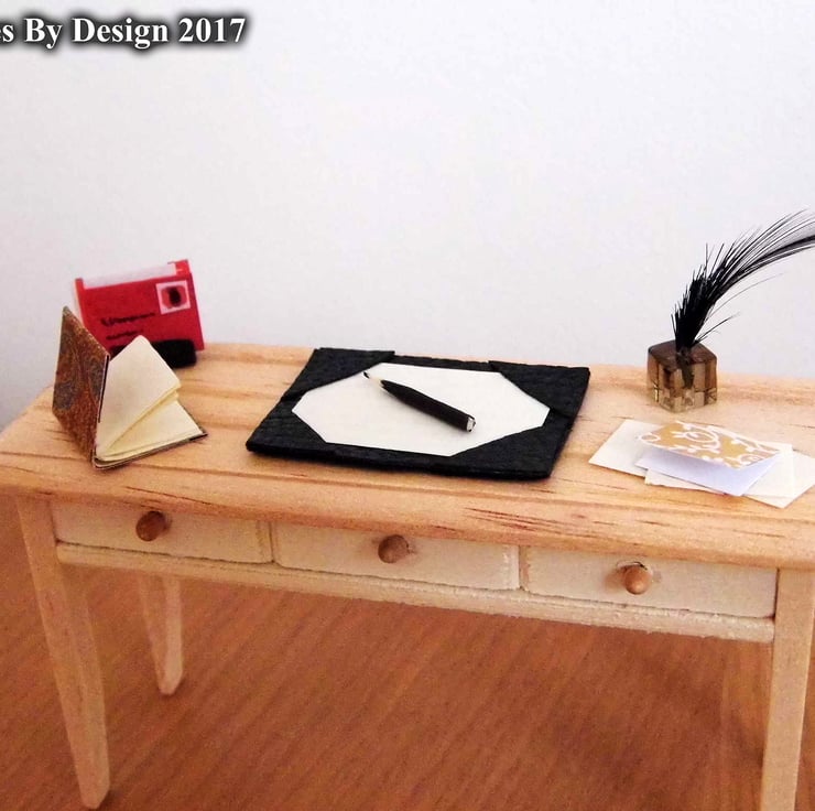 This set comprises of a quill in a glass bottle, a black faux leather blotter, tiny black wooden pencil, small covered book with cream interior pages, a black polymer clay letter rack and an assortment of writing papers, envelopes and cards.