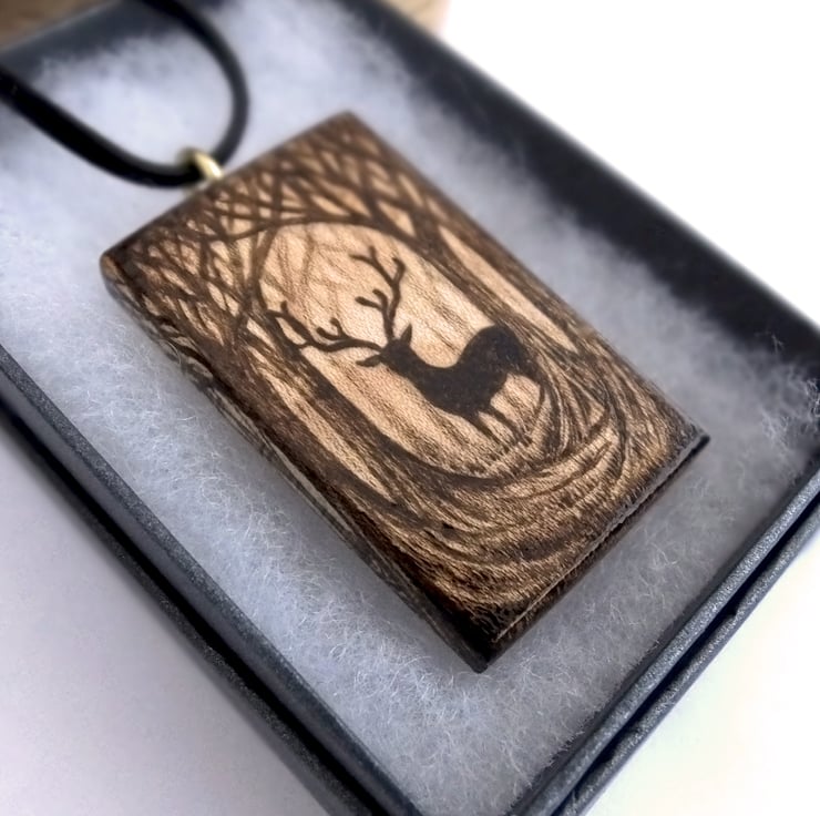 An encounter with a woodland stag, in a forest clearing. This chunky pendant features a stag silhouette, hand burned into the wood using the art of pyrography. The front and side are burned with the design and the reverse is natural.