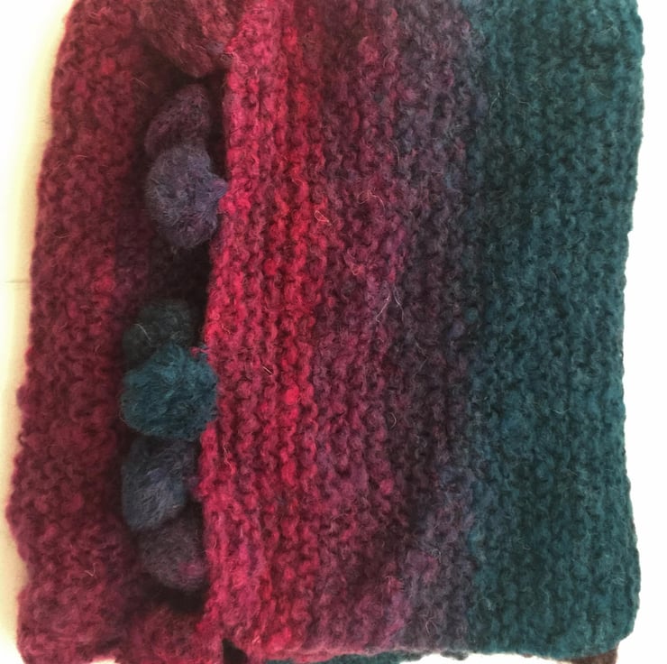 This beautiful scarf is hand knitted in multi-tonal warm mohair blend yarn (9% mohair, 14% wool, 67% acrylic, 10% polyester). The rich colours are beautiful shades of bluey green, heather and pink and the scarf is finished with an attractive pom pom trim.