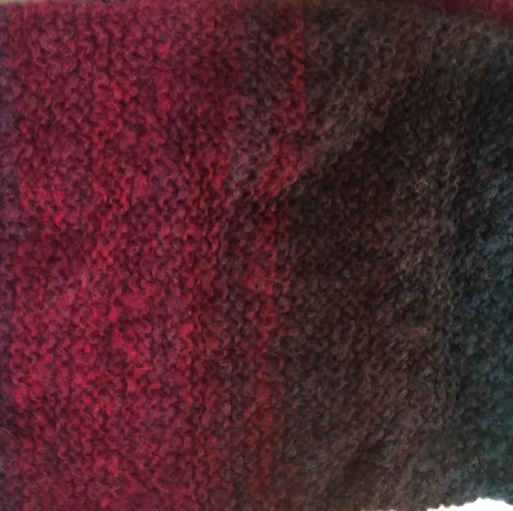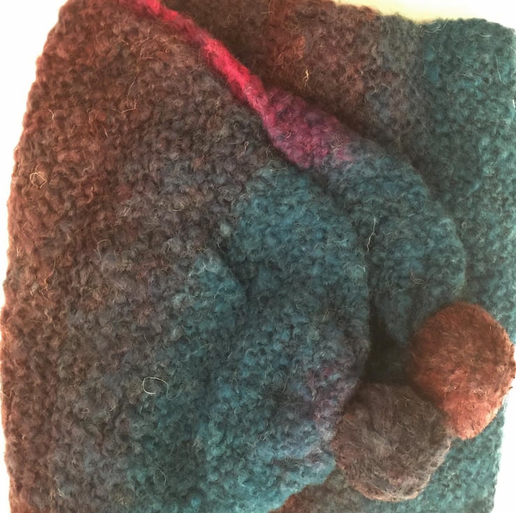 This beautiful scarf is hand knitted in multi-tonal warm mohair blend yarn (9% mohair, 14% wool, 67% acrylic, 10% polyester). The rich colours are beautiful shades of bluey green, heather and pink and the scarf is finished with an attractive single pom pom at each end.