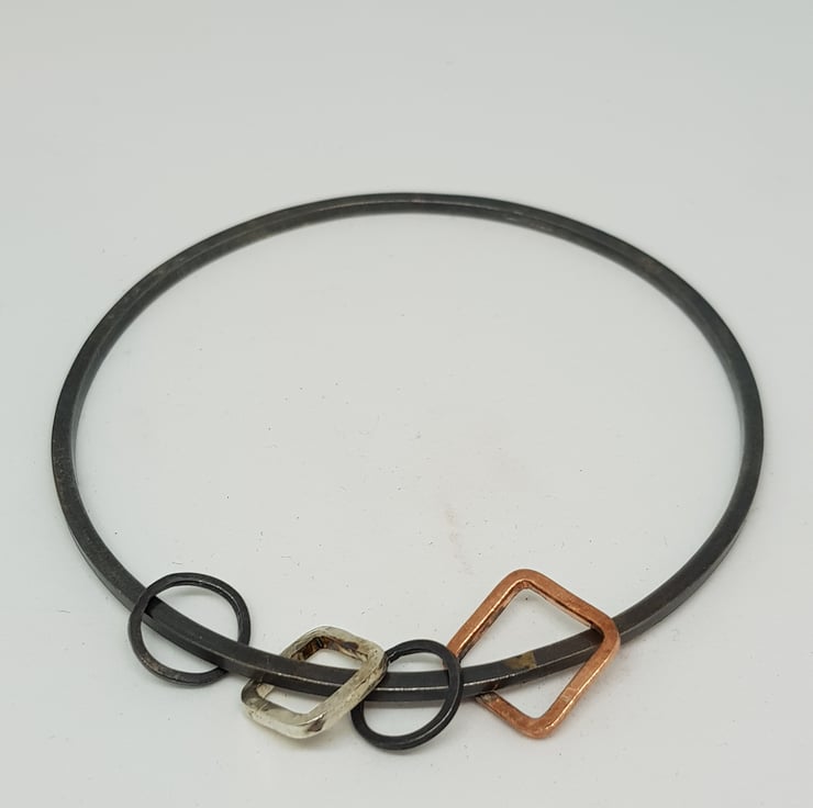 There are four charms hanging from the bangle - two are oxidised silver, one is polished silver and one is copper.