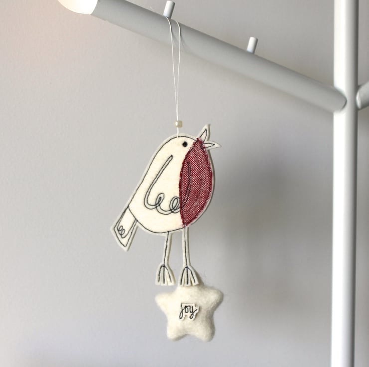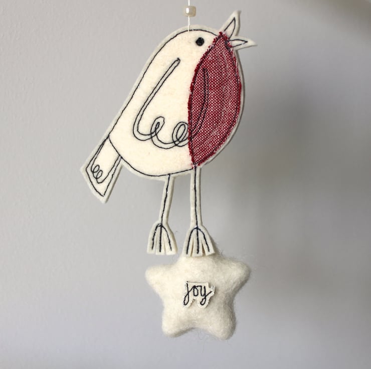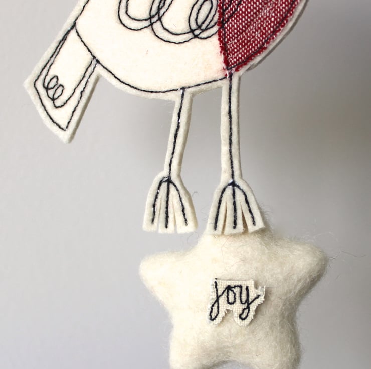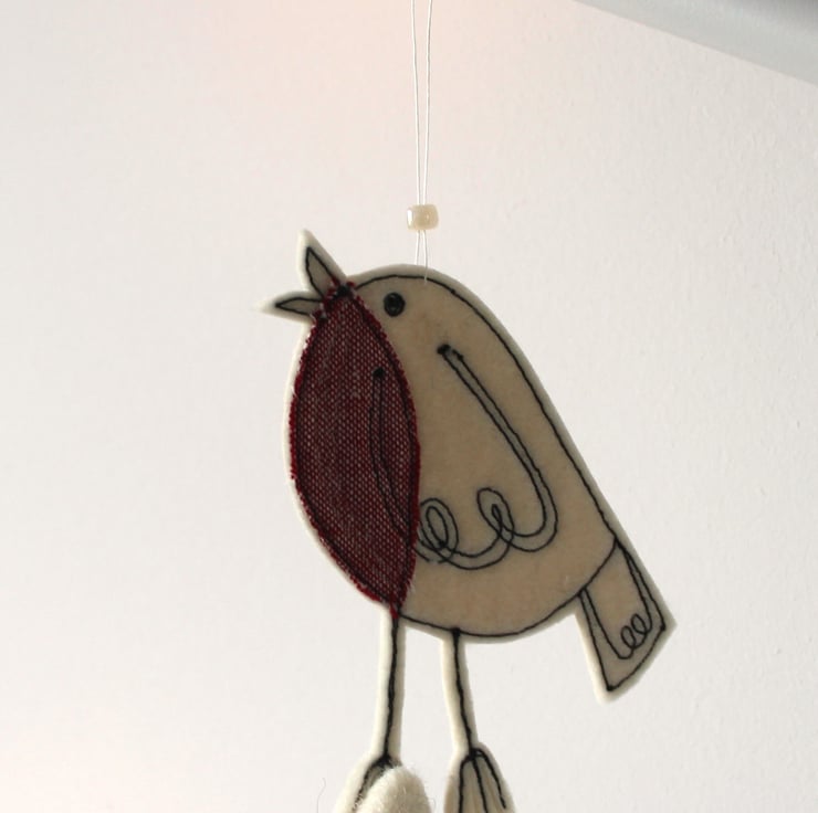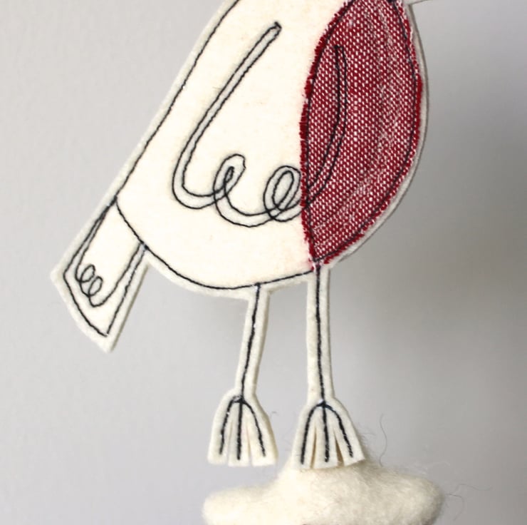 Mr Robin is created using 100% cream wool felt, red fabric and free hand machine embroidery. Suspend him from your Christmas tree and he will make you smile.