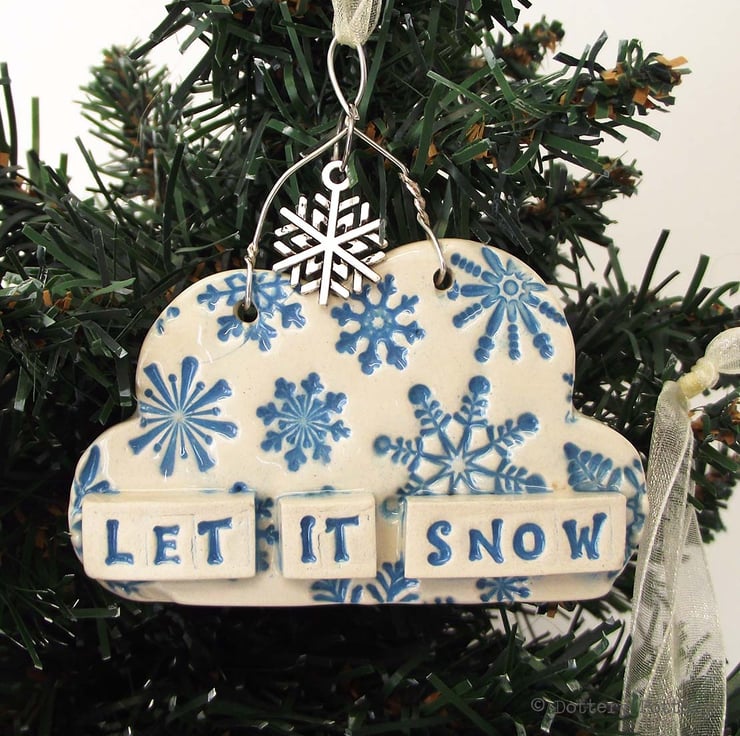 It has been decorated with a snowflake pattern and finished with a glossy, clear glaze. A little silver coloured metal snowflake charm dangles from a metal loop and and it is finished with a matching organza ribbon.