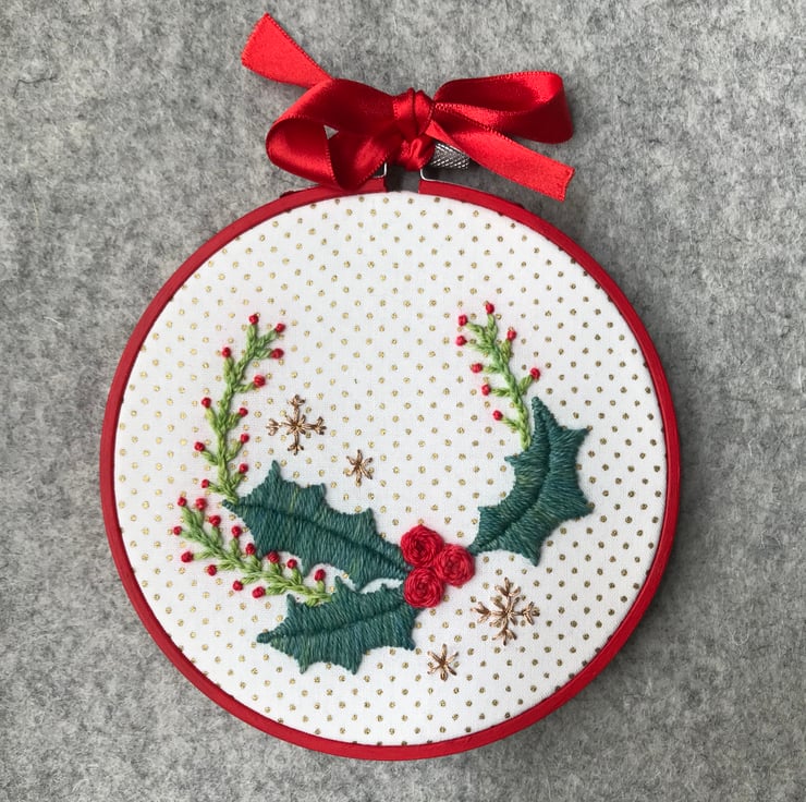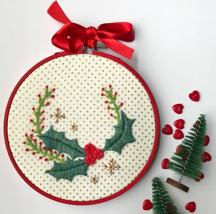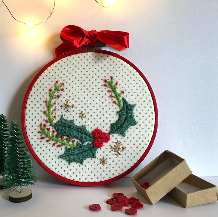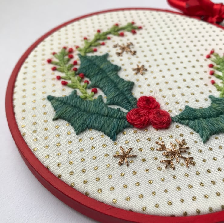 I've used beautiful hand dyed wool to embroider a delicate Christmas Wreath in traditional Christmas colours. Sparkling snowflakes complete the embroidery against a background of gold printed cotton.