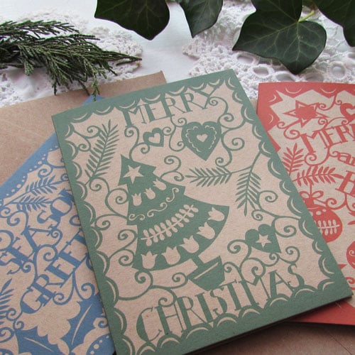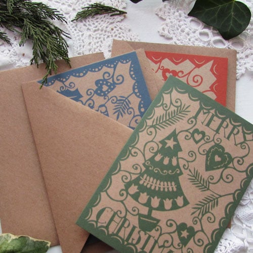 The cards have been digitally printed from original hand cut papercuts. I hand draw and hand cut my original papercuts. These images have then been scanned and professionally digitally printed in the UK on 300gsm unlaminated kraft card.
