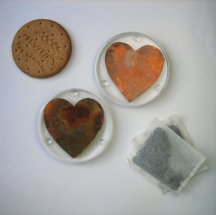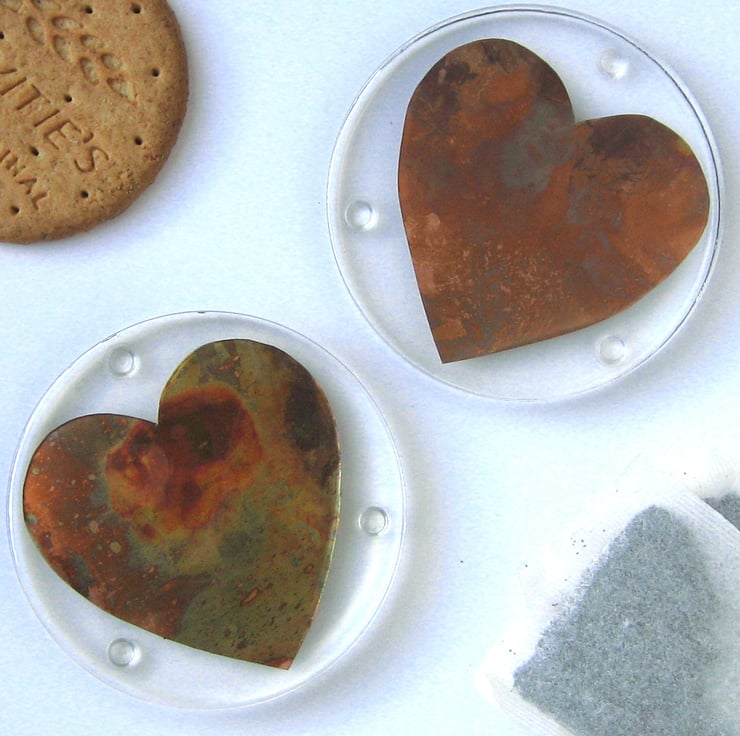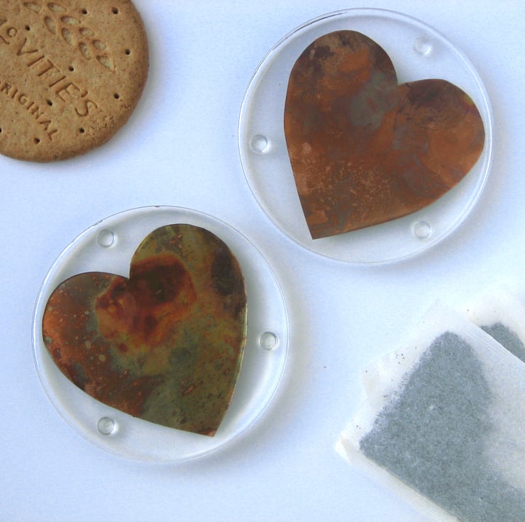 I have made these coasters by oxidising a sheet of copper to produce a random pattern of iridescent effects and cut out two simple heart shapes. The I have set in molds with clear resin.
