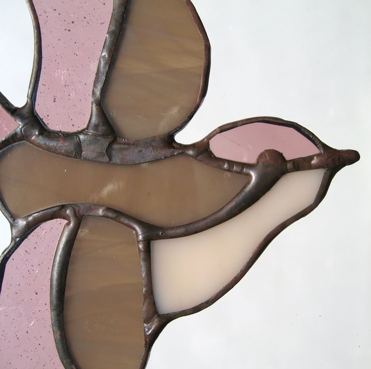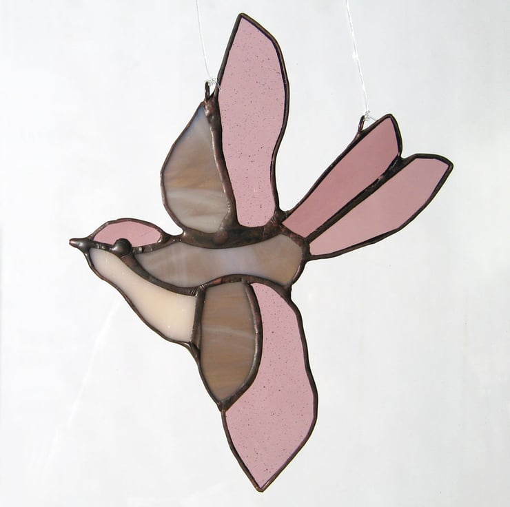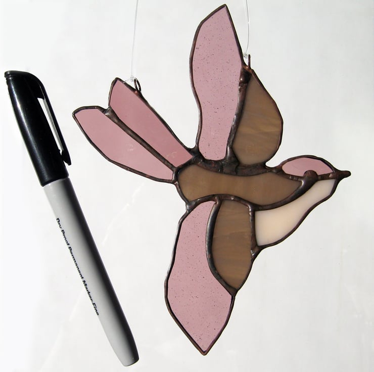 This little bird light catcher has been made using the copper foil technique. Each piece of shaped glass is edged with copper foil, soldered together and finished with a polished bronze patina.