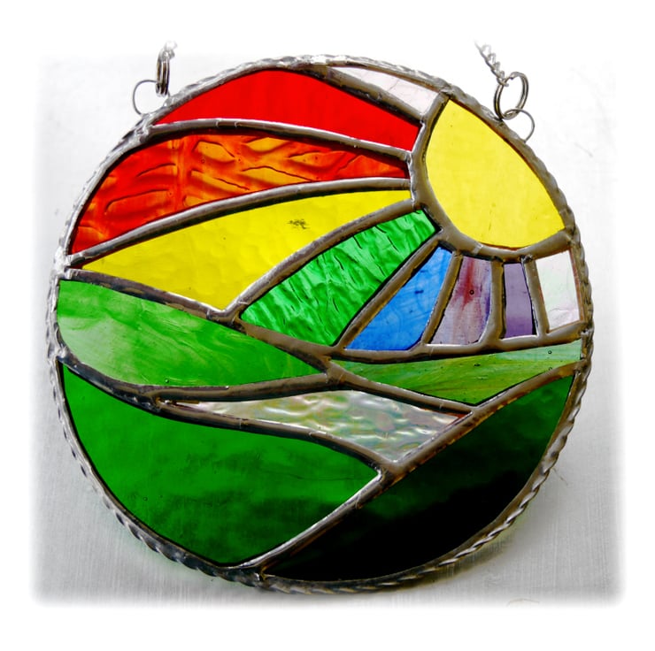 The sun's rays are a rainbow with, at either side a little piece of clear sparkly glass as that's how rainbows happen. Under the rainbow are green fields and a patch of sparkling water as the sun is shining on it.