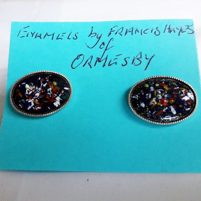 After building up a base of several layers of clear enamel on the copper ovals I have added a layer of black. I have then fired a further layer of enamel chips to the black. The two ovals are not identical, of course.