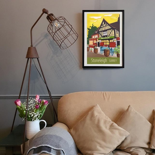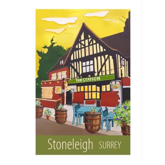 A contemporary travel poster style print of the Station pub in the centre of Stoneleigh, Surrey, from my own original acrylic painting.