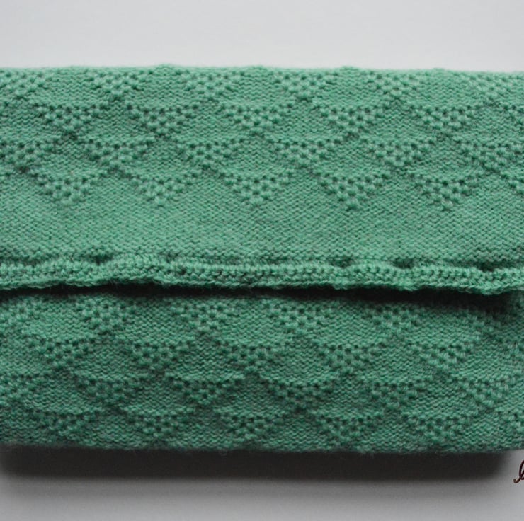 Handmade bag, machine knitted in pure new wool, fully lined and with a long shoulder strap. Fastens with two hook and eye closures.