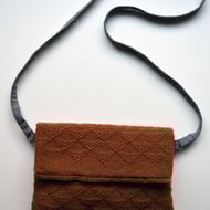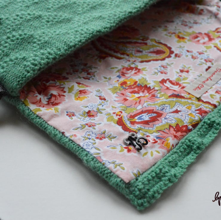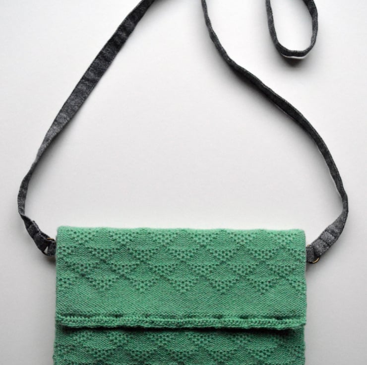 Handmade bag, machine knitted in pure new wool, fully lined and with a long shoulder strap. Fastens with two hook and eye closures.
