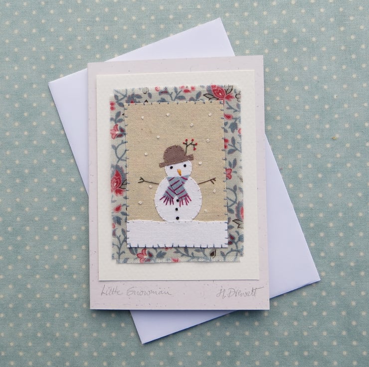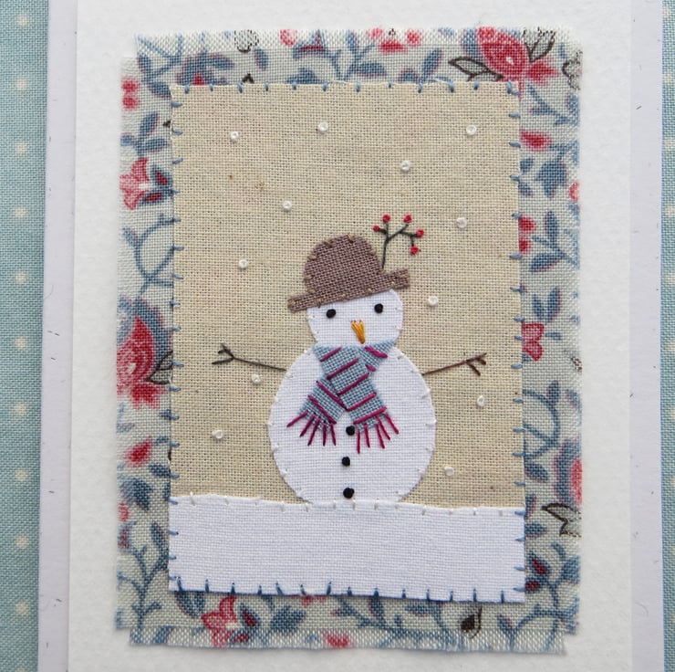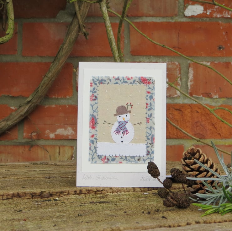 A miniature hand-stitched applique snowman cut from recycled cotton with intricate embroidered details, backed with a pretty piece of cotton Moda fabric. Perfect for Christmas, a card to keep, perfect for Christmas decorating too!
