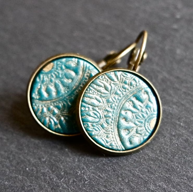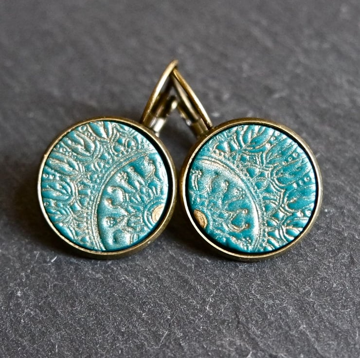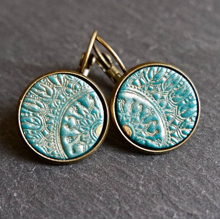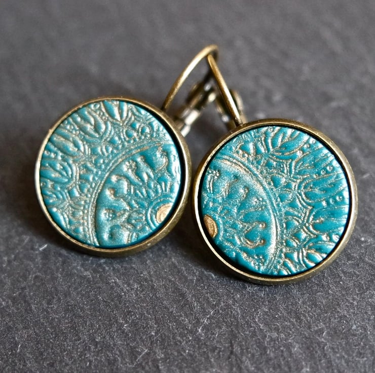 Beautiful turquoise and bronze plated earring dangles with handmade mandala cabochons.