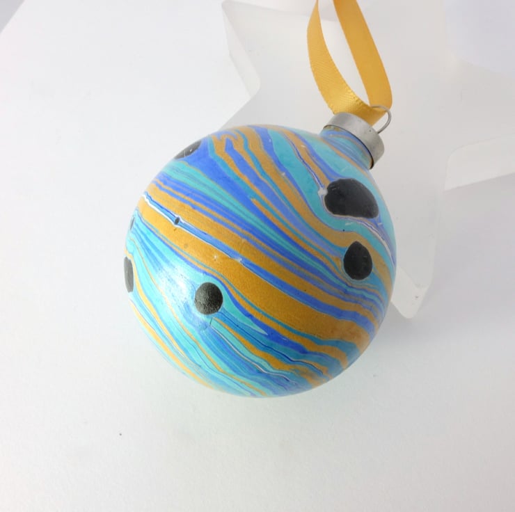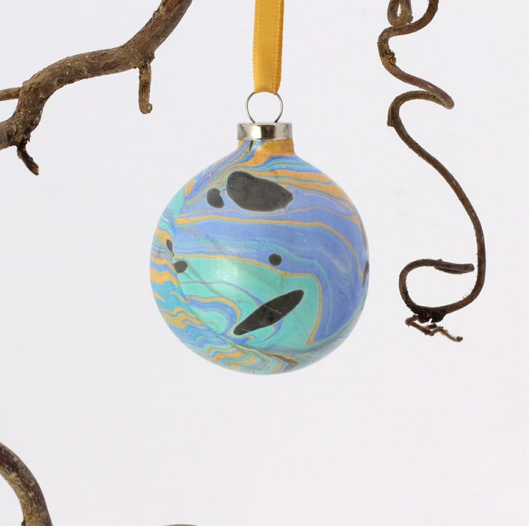 The planetary one! This unusual ceramic Christmas bauble masquerading as a planet has been marbled directly onto the surface in a lovely combination of blue, aquamarine, gold and black.