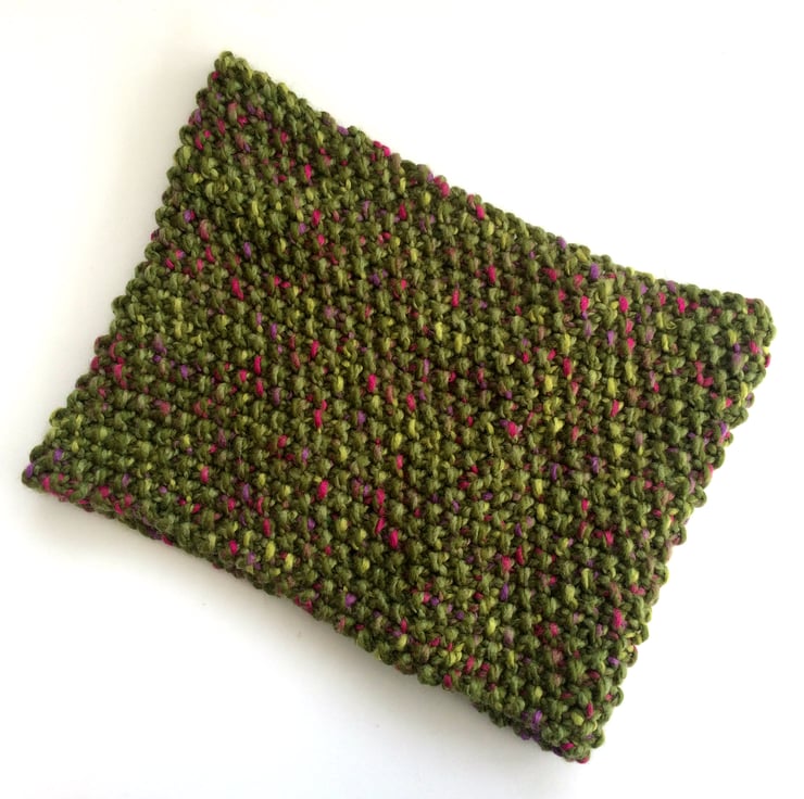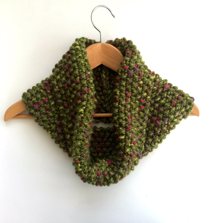 Green (with flecks of red and purple) chunky moss stitch tweedy knitted snood. Hand knitted in a 80% acrylic , 20% wool yarn. The wool fibres make this yarn especially warm in winter, whereas the acrylic makes it super to wash and look after,