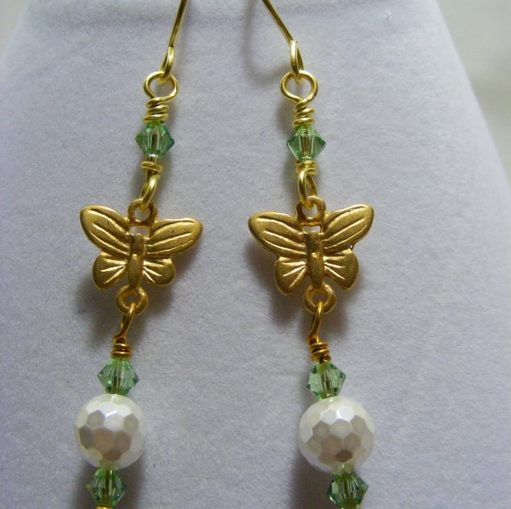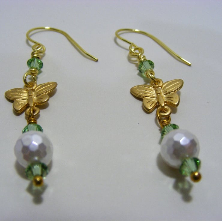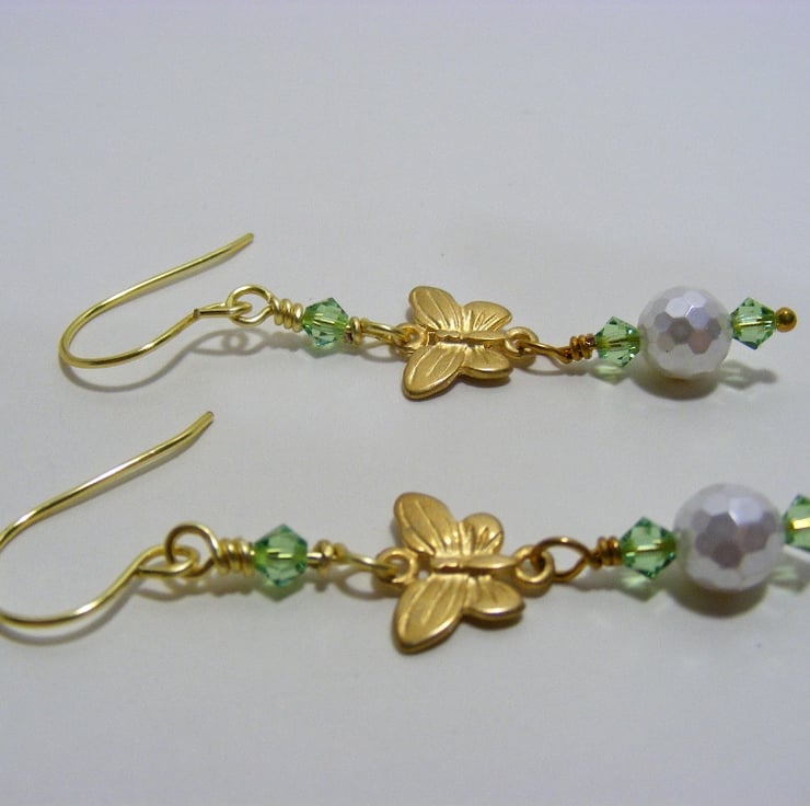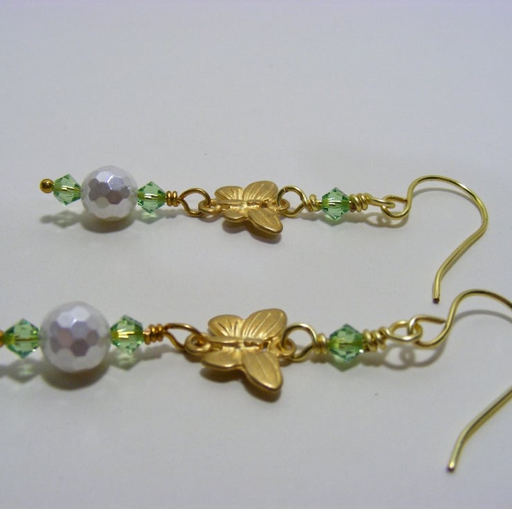 Earrings are made with 8 mm white faceted shell pearls, 4 mm peridot Swarovski elements and 9 x 13 mm gold plated butterfly connectors. Ear wires are handmade with gold plated copper wire.