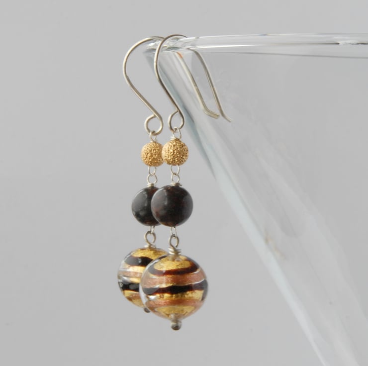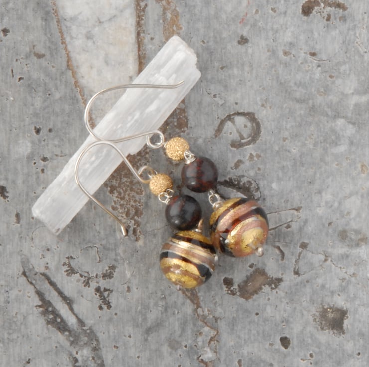 These dangly earrings have a graduated drop terminating with a luxurious gold foiled murano glass bead. The murano bead has spirals of twinkly brown goldstone and bitter chocolate brown glass over the gold foil core and it has all be encased in clear glass to protect the design. The colour scheme of this is picked up by the other beads a dark brown jasper bead and a frosted gold plate bead, they have lots of sparkle. They are finished with simple hand made sterling silver hooks.