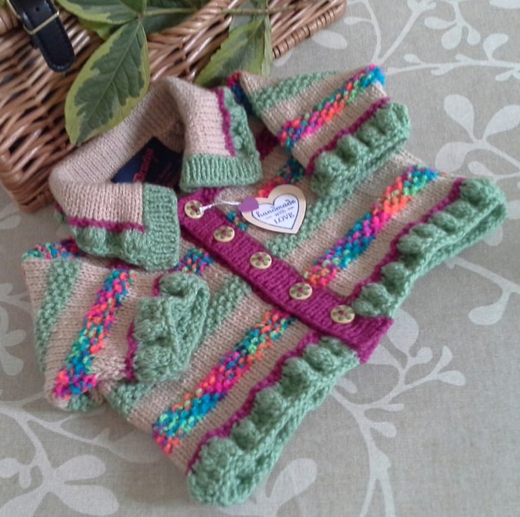 A beautiful eye catching jacket any mother would love to receive as a special unique gift for a newborn baby girl. I have lovingly designed and hand crafted the jacket personally using quality branded French and British manufactured yarns. The garment is machine washable at low temperature settings. It has the care instructions woven within the luxery branded Demelza garment label for lasting reference. The buttons are made from genuine wood with a delicate flower design on them.