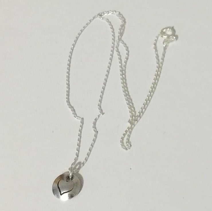 This beautiful necklace is made from a hand made sterling silver charm. The charm is approximately 1 cm across has a subtle heart stamped into it and has then been domed to create shape. The charm has been given a brushed finish and polished finish.
