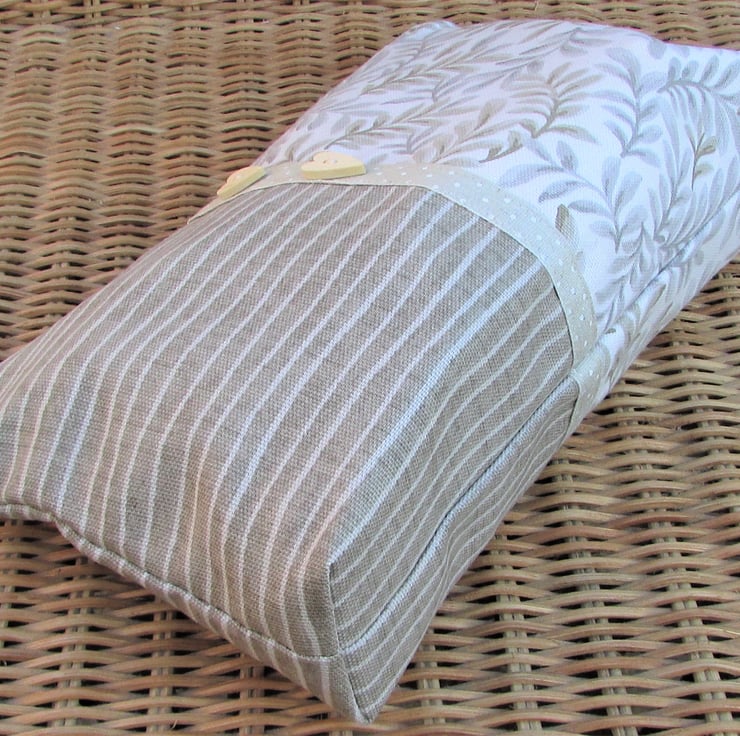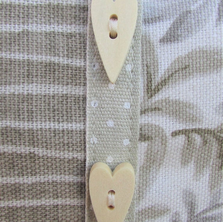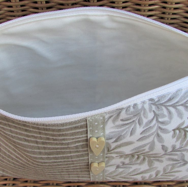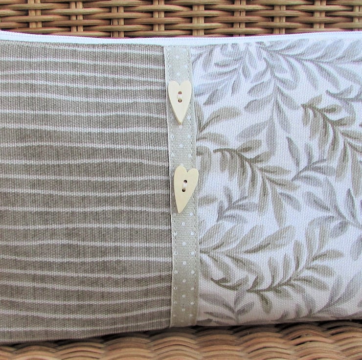 A large cosmetic bag in two co-ordinating fabrics. One half is a lovely cream fabric with a beige and grey leafy pattern and the other half is a beige fabric with narrow cream wavy stripes. The join of the two fabrics is covered with beige twill ribbon with white polka dots and finished with two wooden long heart buttons. The make up bag has a cream zip and is lined with cream fabric. The base of the bag is boxed giving lots of space inside.