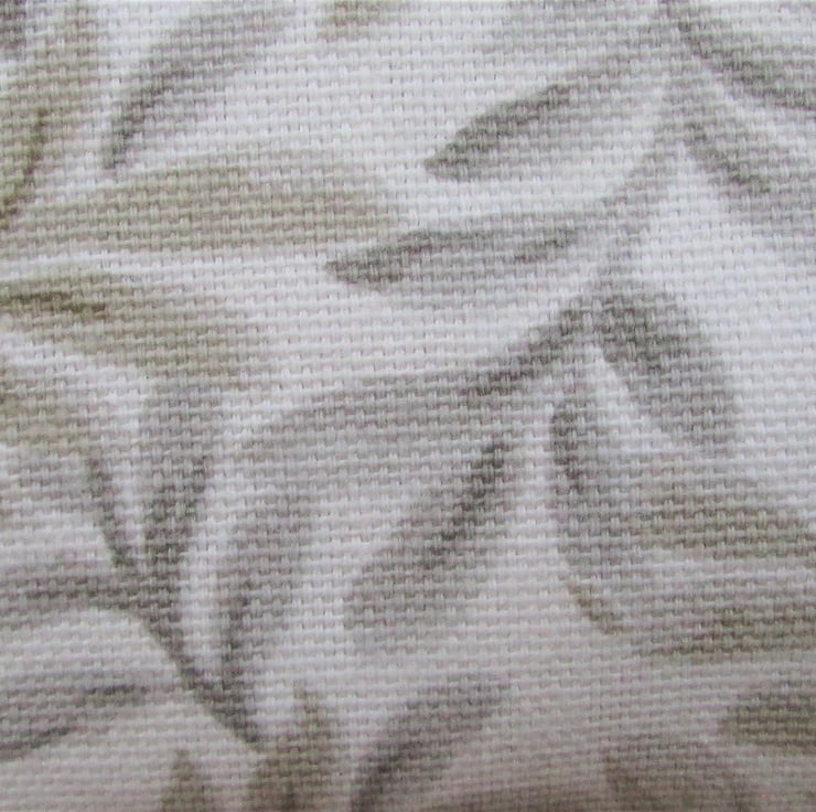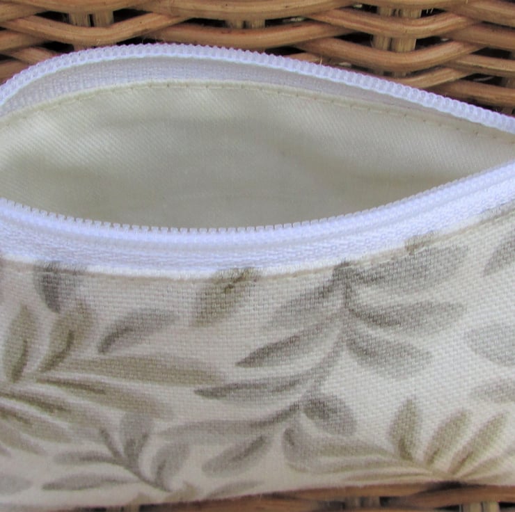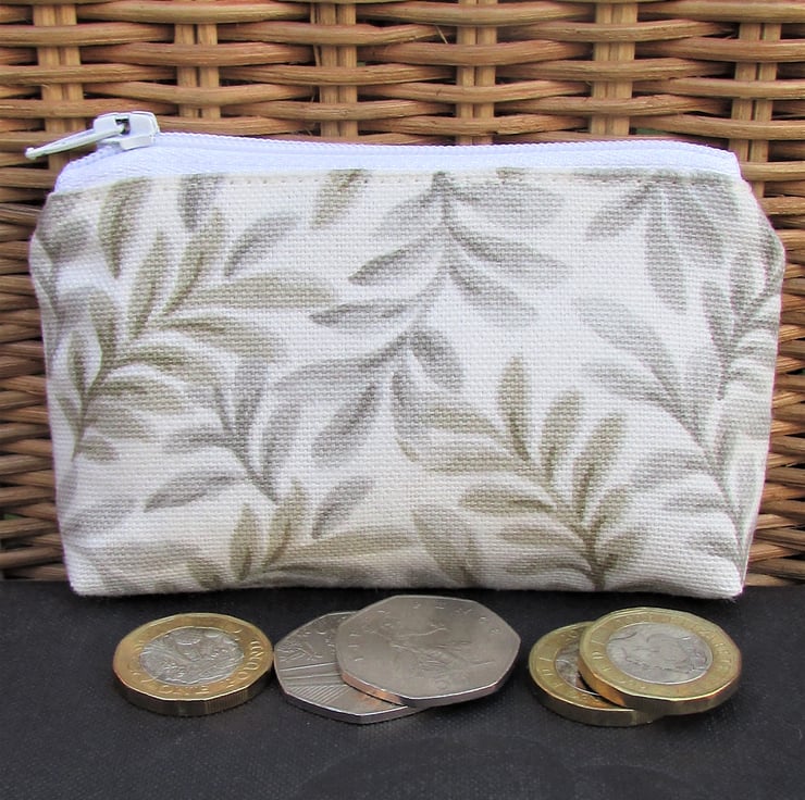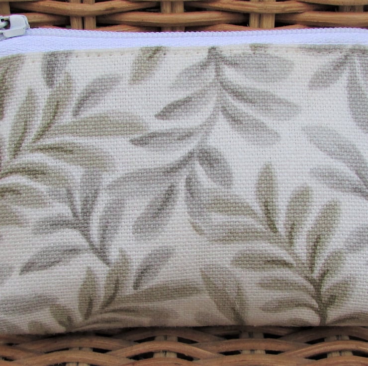 A small coin purse with a lovely leaf print pattern in beige and grey on a pale cream background. The coin purse has a white zip and is lined with cream fabric. The base of the purse is boxed to give a spacious interior.