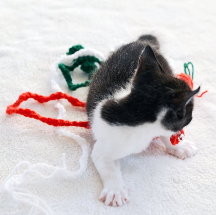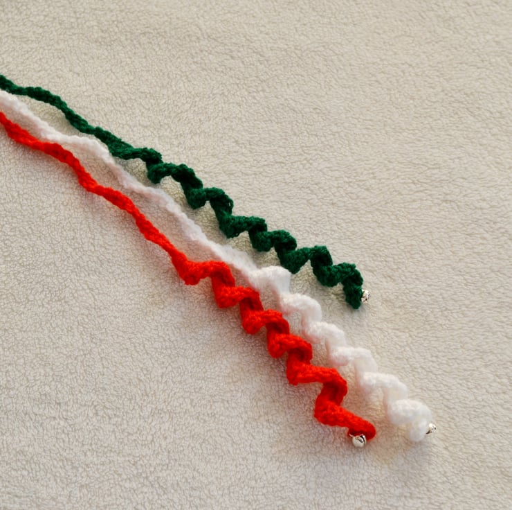 Made in 100% acrylic yarn in green, bright red and white. The tip of the toy has a silver coloured bell which really jangles to attract the cats.