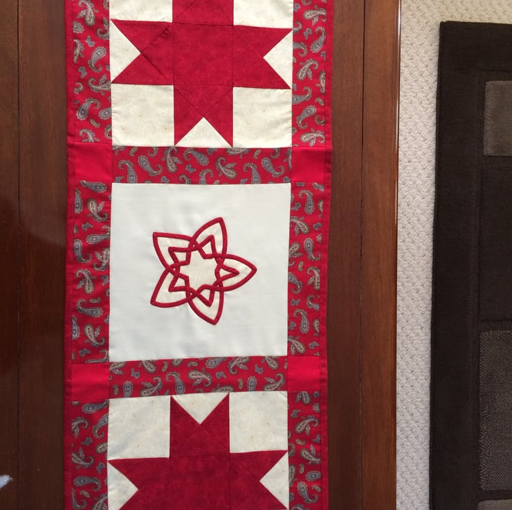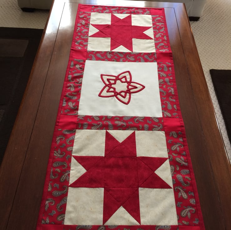A 46"x18"(117x46cm) Celtic applique and patchwork table runner. The table runner is made up of three blocks. The centre block is a red Celtic hand appliqued intricate star design with a pale gold/cream insert on a plain cream background. The two blocks on either side are the Ohio star patchwork pattern in a red marbled cotton and the pale gold/cream cotton. Each block is edged with 2.5" bands of a toning red/cream/grey paisley patterned cotton and plain red squares at each intersection. The runner has a red marbled cotton double thickness binding hand finished on the reverse side. The backing is a plain cream cotton.