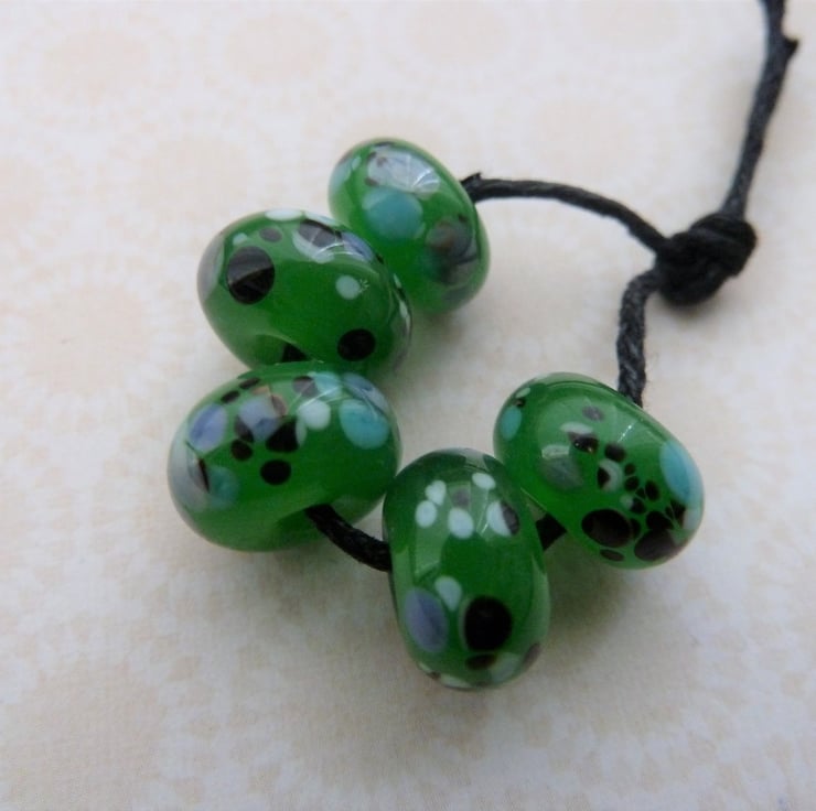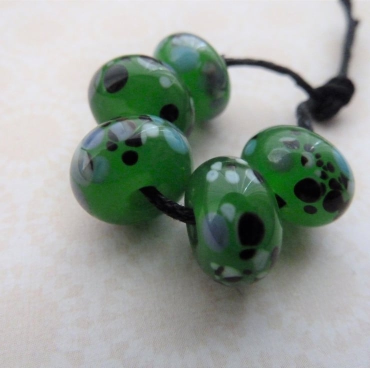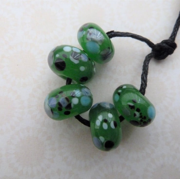 A set of 5 lampwork glass beads made with green glass and rolled in frit.