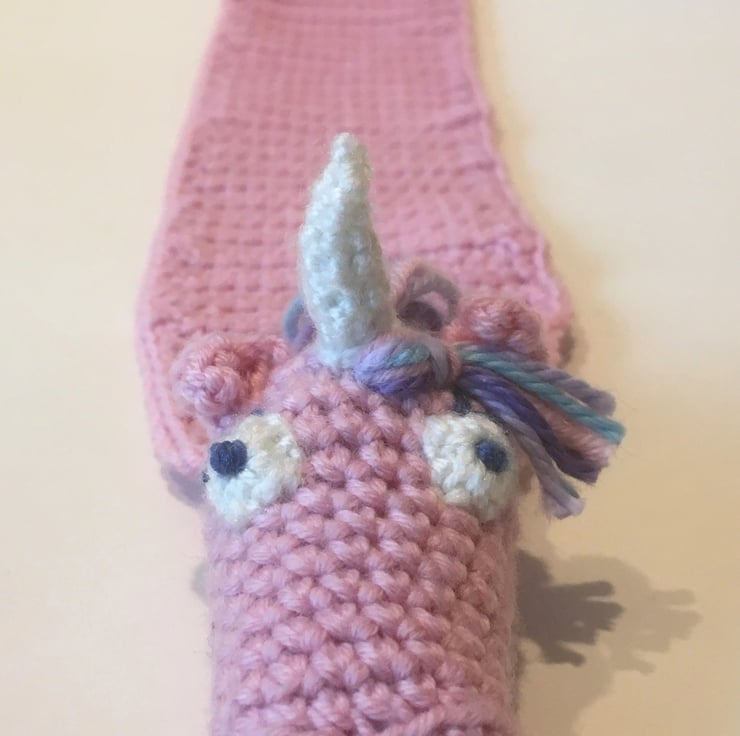 This soft pink unicorn scarf wraps herself around your child's neck, and tucks her tail under her neck, to keep it snug. She is made from a very soft merino wool, and is designed to distract from the chore of dressing for the cold, and encourage your child to wrap up warm. She has a colourful, rainbow mane.