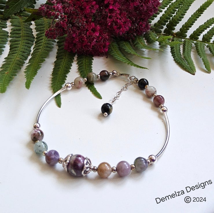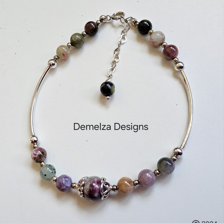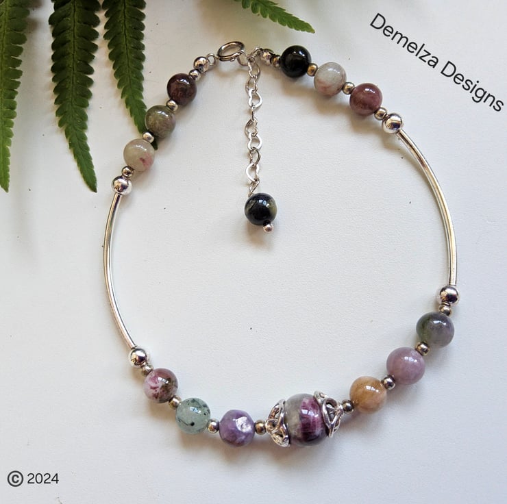 This beautiful delicate bracelet has been lovingly designed and hand crafted using quality natural tourmaline round gemstones complimented with all 925 sterling silver components, including a sweet heart extender chain. It will comfortably fit a ladies wrist size up to 8 1/2" inches. It lends itself to everyday wear on it's own or to wear with other sterling silver bracelets. The bracelet has been constructed using strong professional stainless steel jewellers wire for lasting durability.