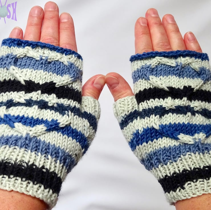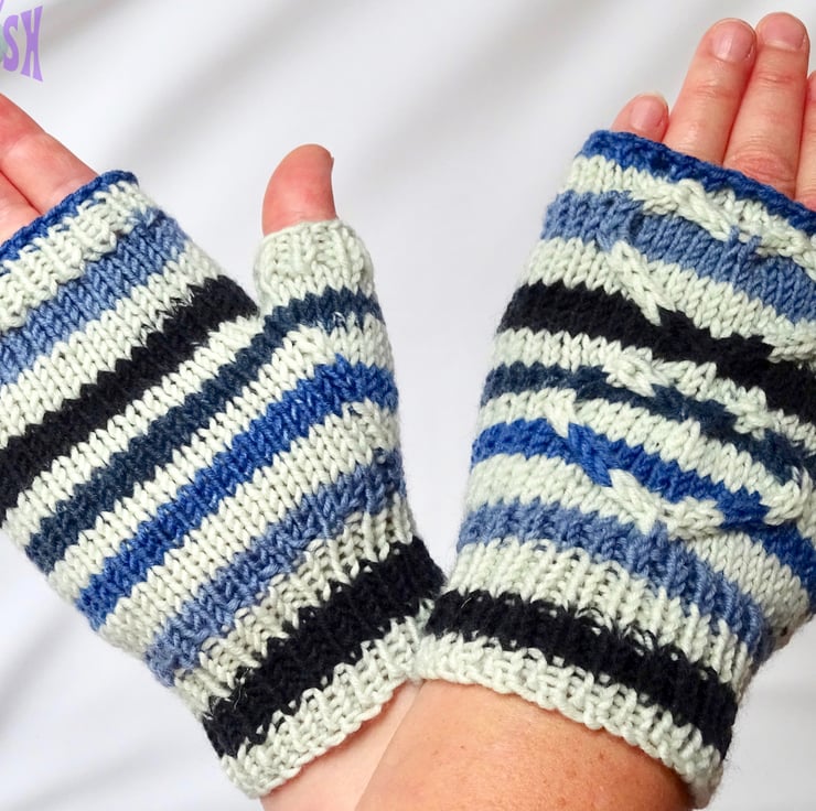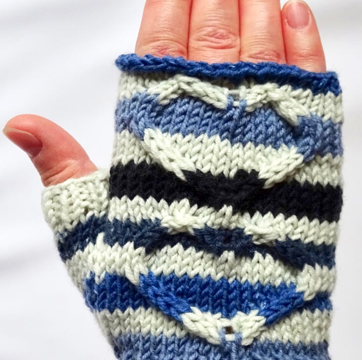 Striped fingerless mittens in shades of blue and cream, hand knit with a heart pattern on the back. Made with a gorgeously soft and squishy wool.