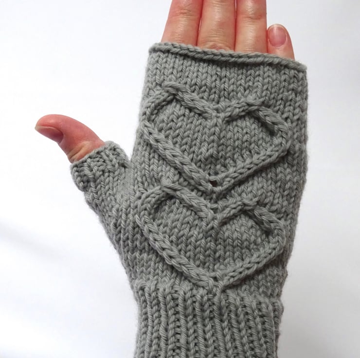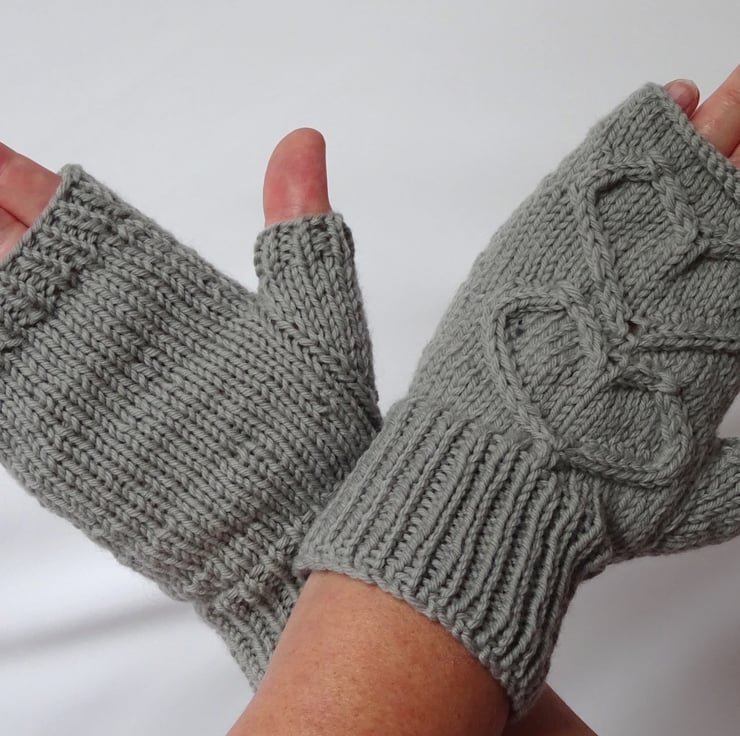 Smokey grey fingerless mittens with a heart pattern on the back and a smooth, stocking-stitch palm.