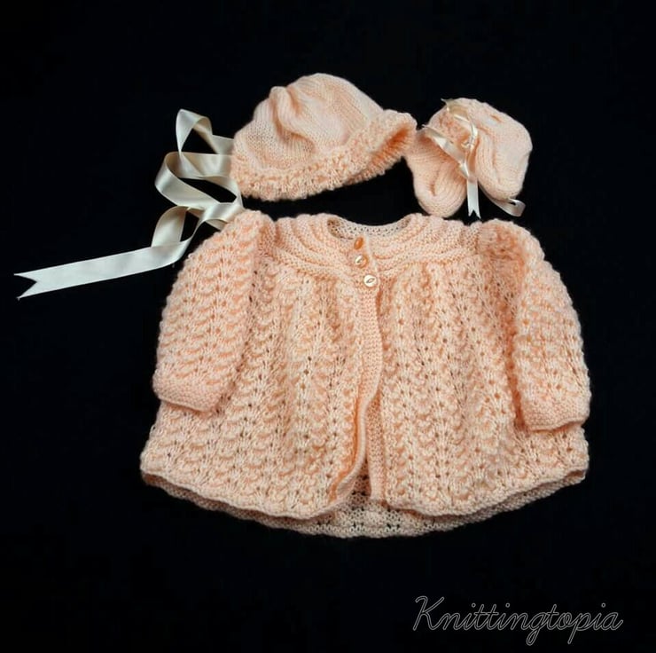 Hand knitted baby cardigan bonnet and booties to fit 12 months - peach - matinée set - knitted baby clothes - baby knitwear