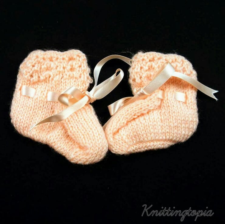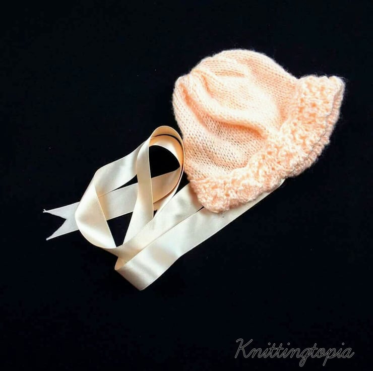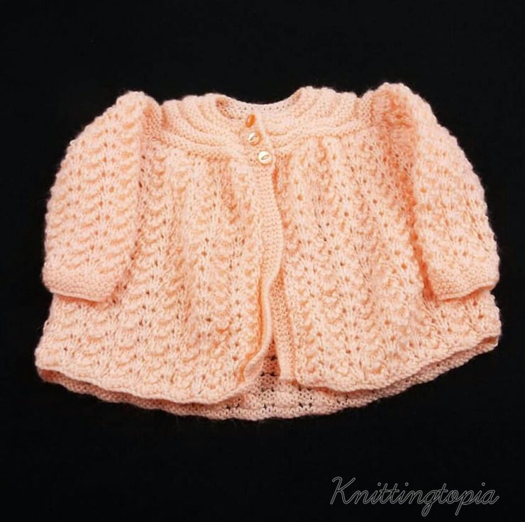 This traditional style baby matinée set comprises of a cardigan, bonnet and booties. It has been hand knitted in a lovely peach yarn and has an all over textured pattern.