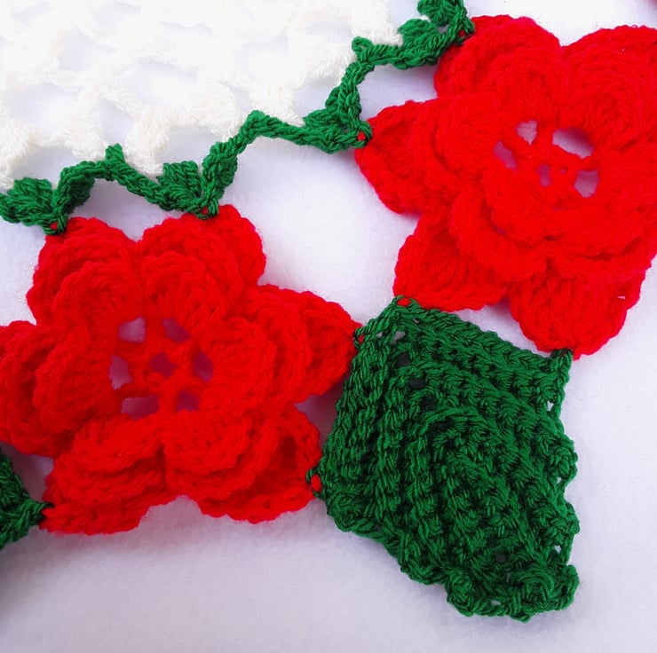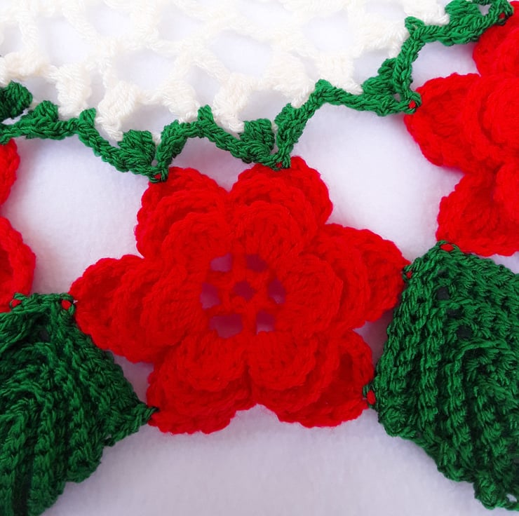 Hand crocheted vintage style doily - red roses - green leaves - table centerpiece - chic home decor - dresser decoration