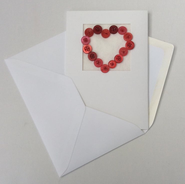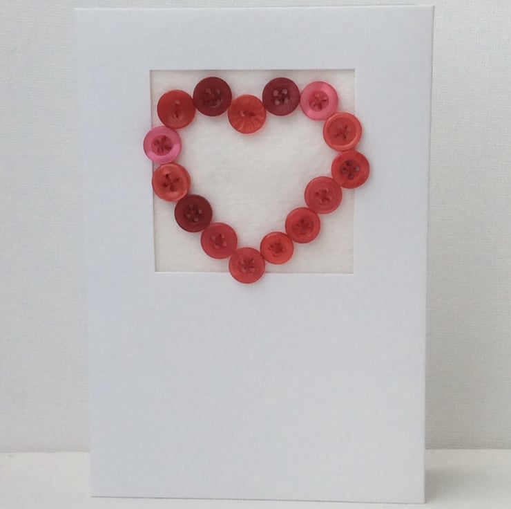 Beautiful, unique card, fifteen small red buttons in a heart shape, hand sewn onto white felt and set into a white card with a square window. The card measures approximately 10.5 x 15cm and is blank inside for your own message.